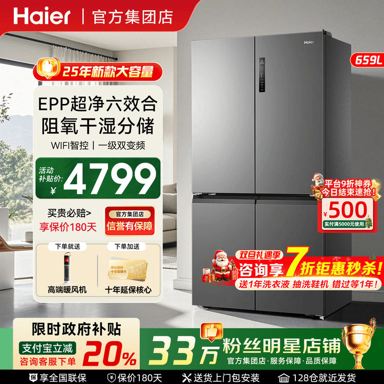 推荐理由:政府补贴20%】海尔电冰箱659L十字对开四门家用大容量一级旗舰店