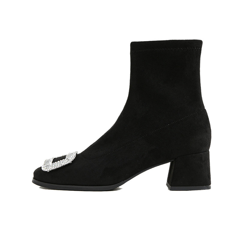 推荐理由:粗跟方头短靴女2025新款百搭水钻方扣弹力袜靴低跟黑色绒面瘦瘦靴
