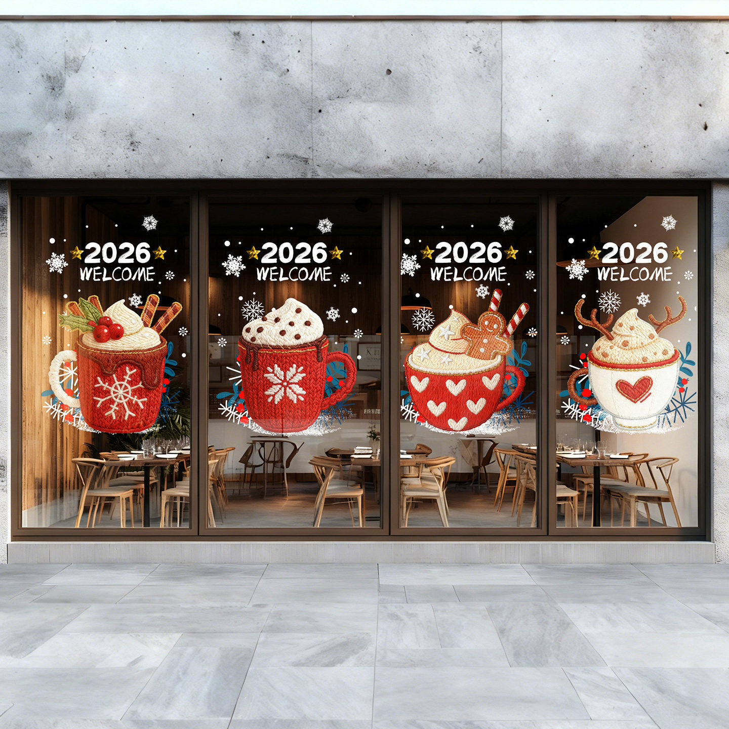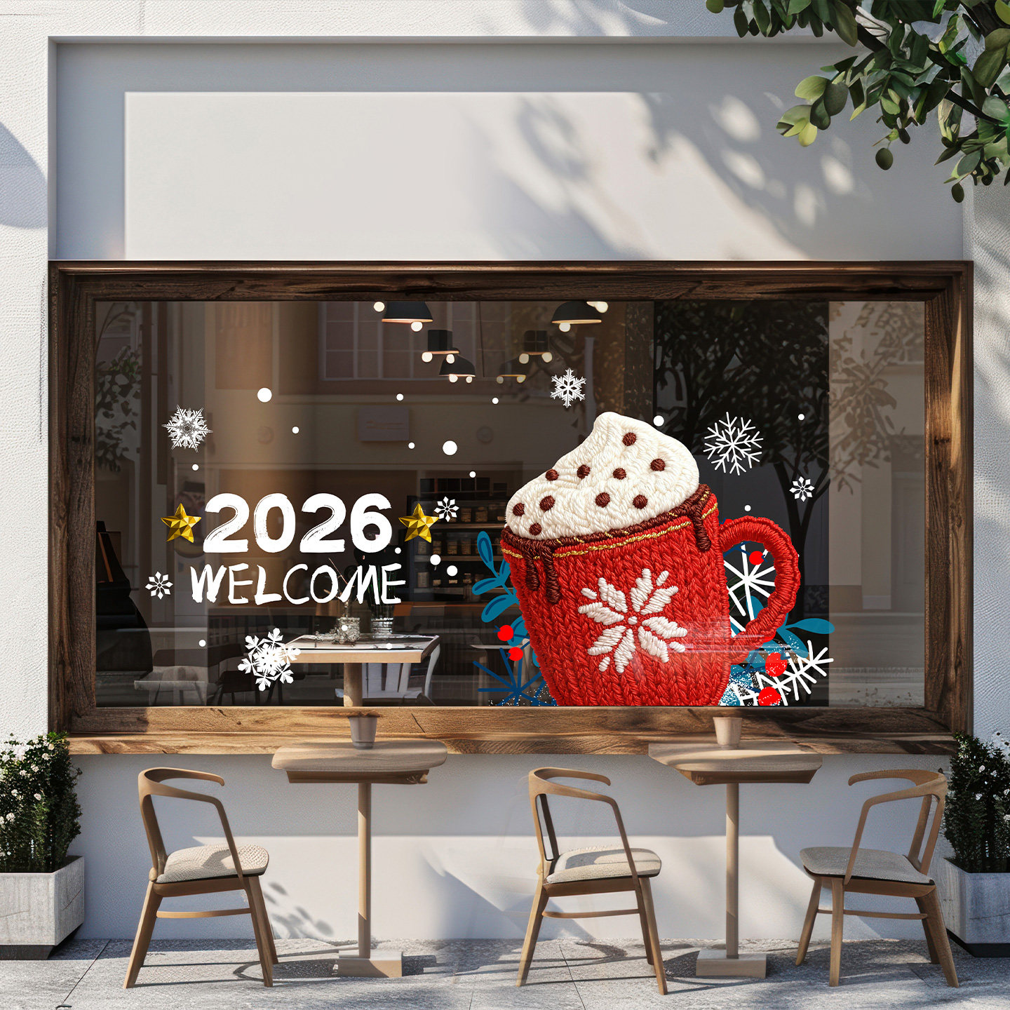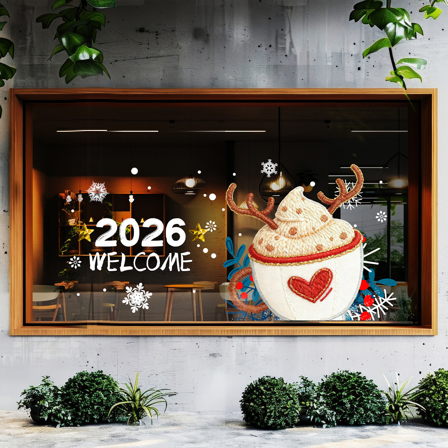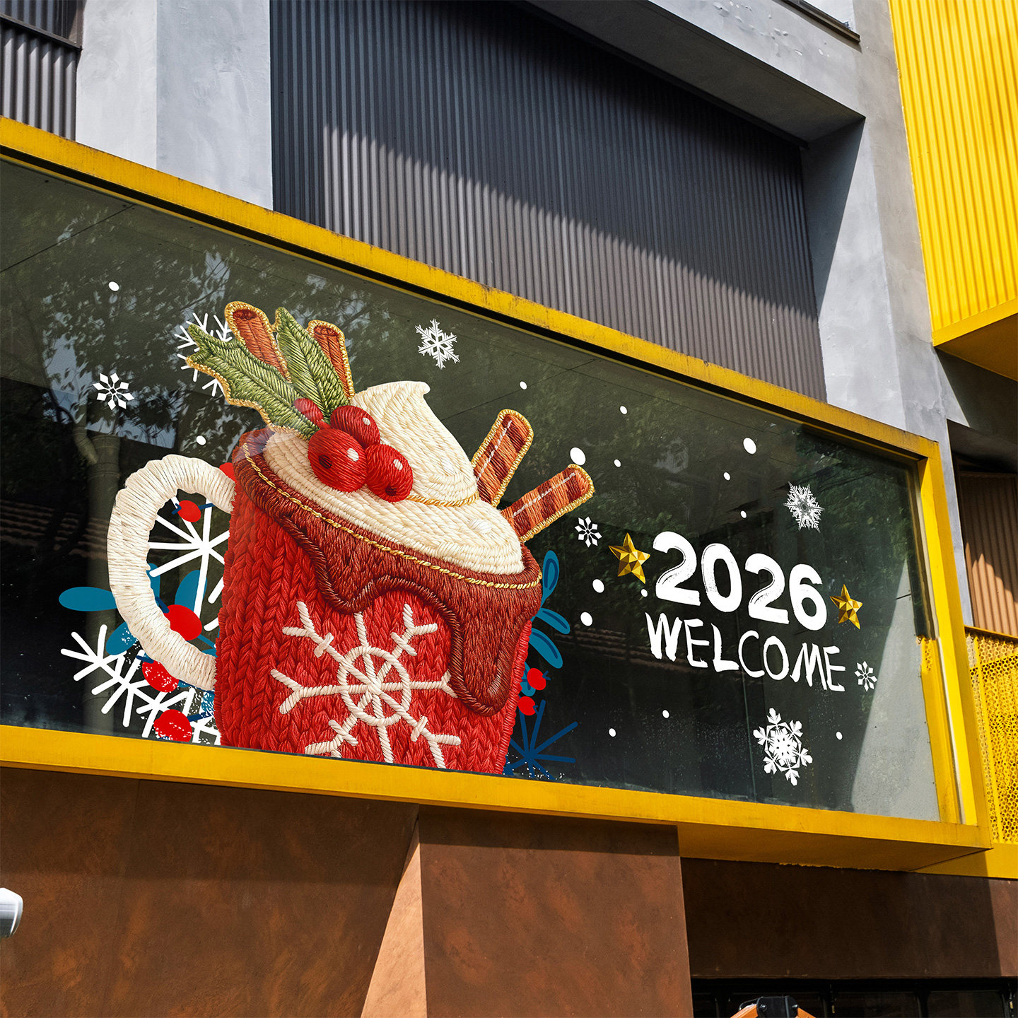 咖啡店圣诞节窗花各式圣诞咖啡杯造型刺绣毛线风格新年2026网红贴