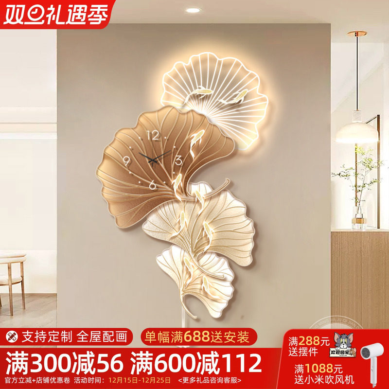 奶油风挂钟玄关装饰画银杏叶走廊过道尽头墙时钟挂画静音摇摆钟表