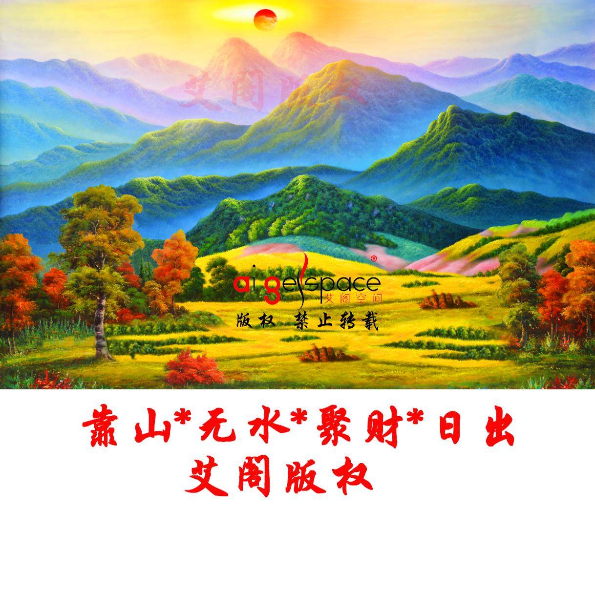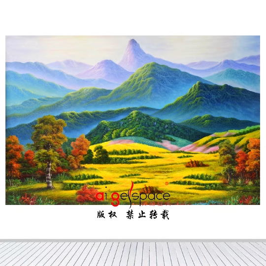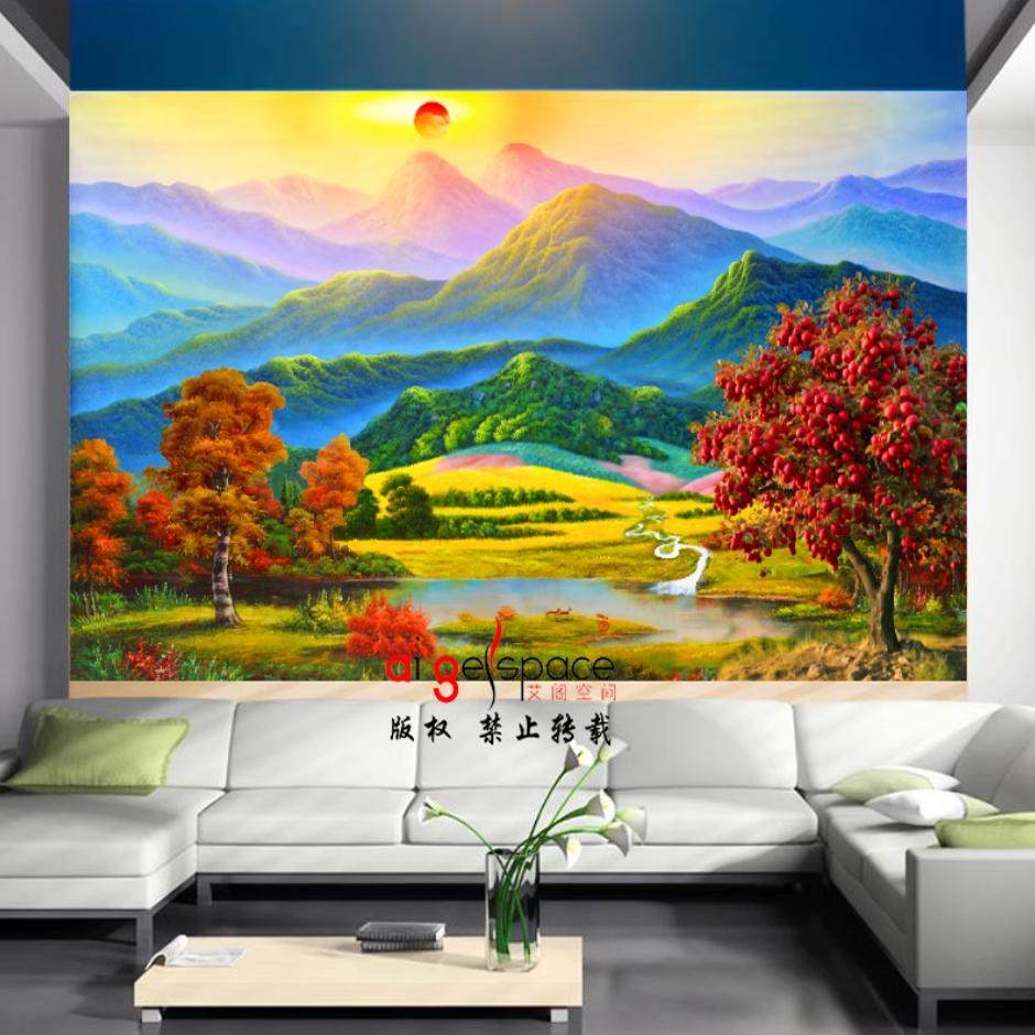 推荐理由:定制高清8D油画山水风景日出苹果树背有靠山客厅沙发背景壁G05628
