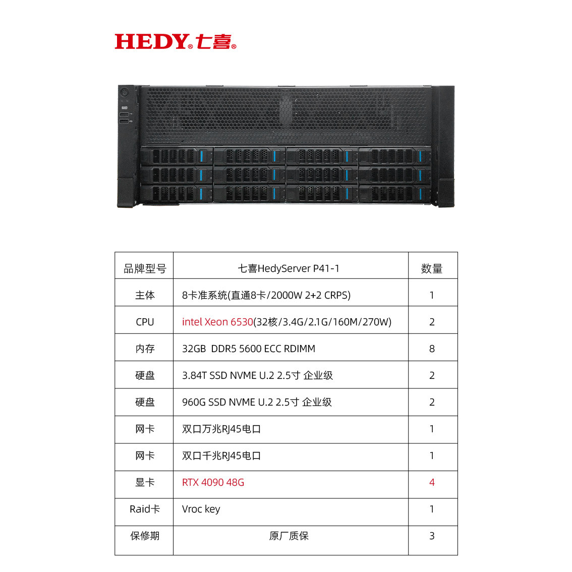 推荐理由:七喜HEDY HedyServer P41-1服务器/2*Xeon 6530/8*32G D5/2*3.84TB/2*960GB/4*4090 48G