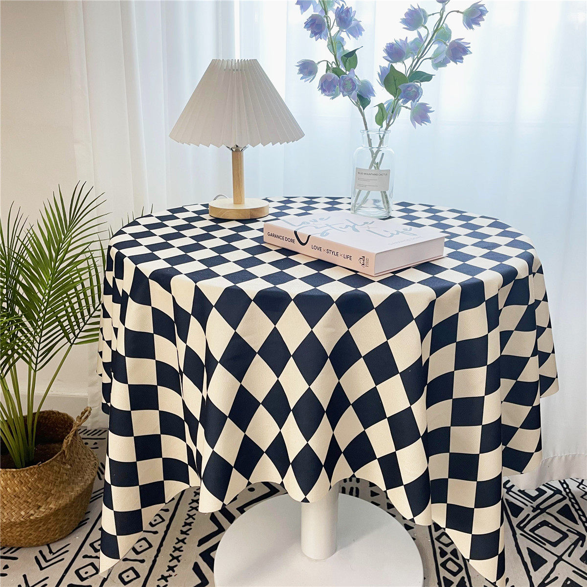 ins复古美式菱形黑格子桌布棋盘圆桌长方形装饰绒布茶几餐桌布