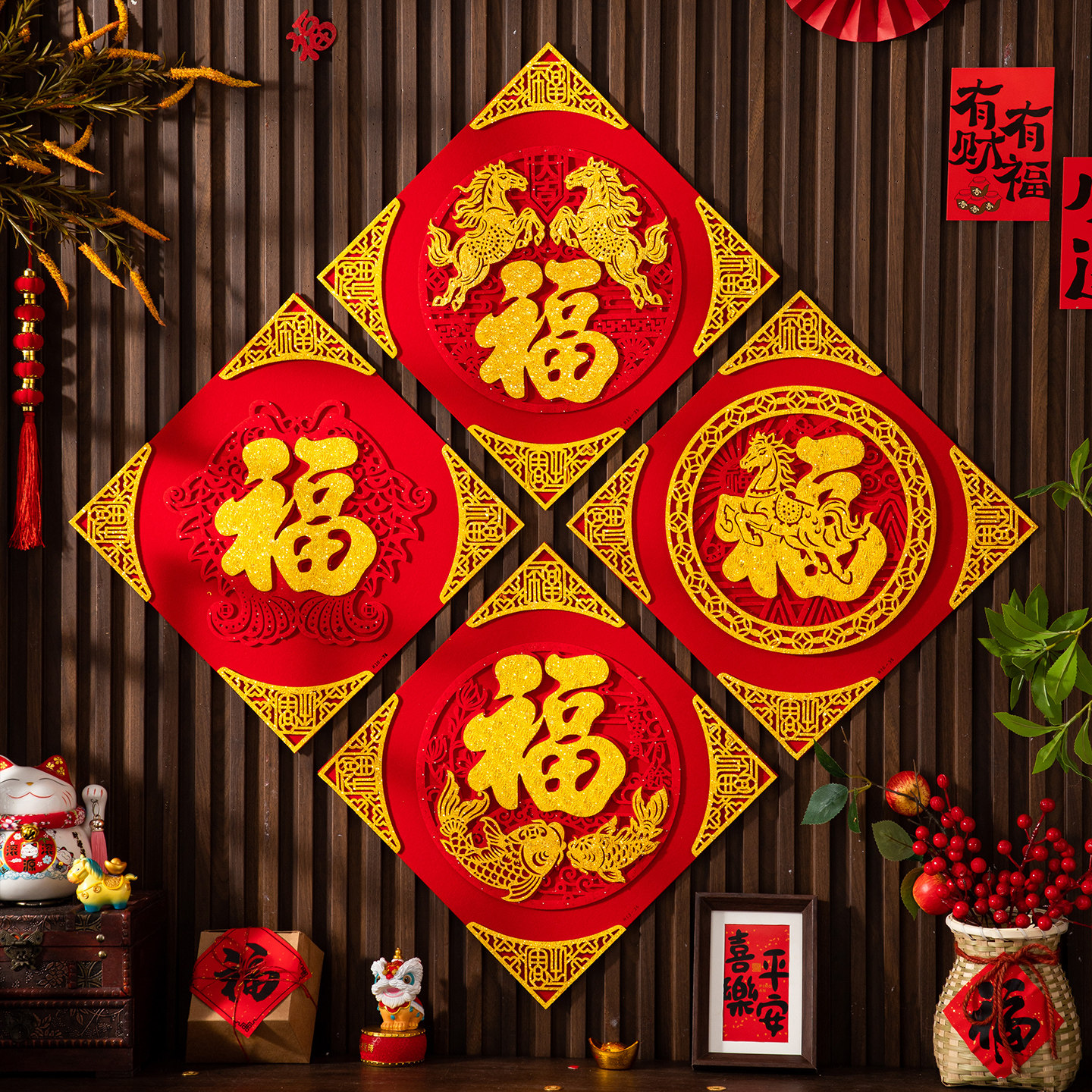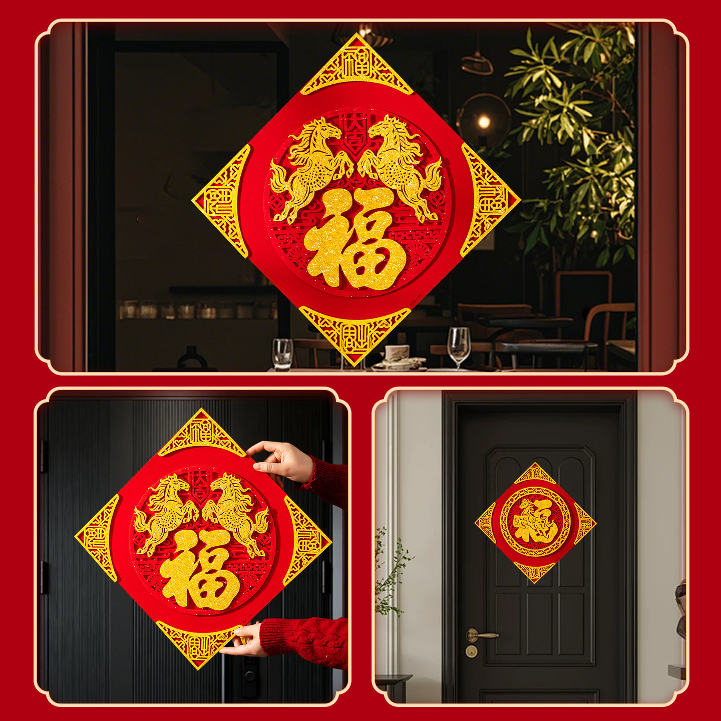 2026新款门幅马年生肖立体镂空烫金福字贴画过年家用大门装饰贴纸
