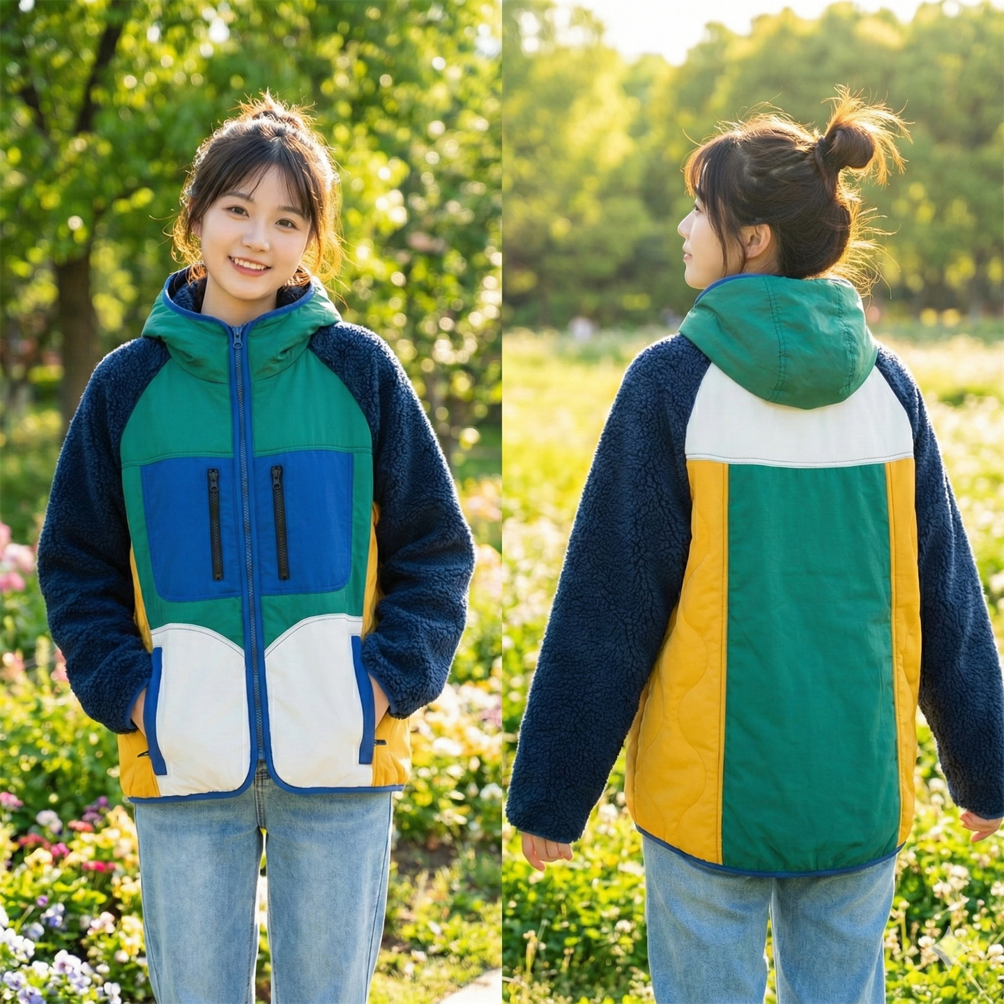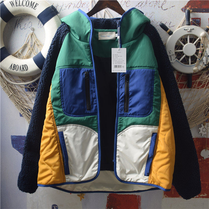 推荐理由:日系软妹原宿风童趣拼接撞色宽松工装连帽薄款羊羔毛棉衣外套少女