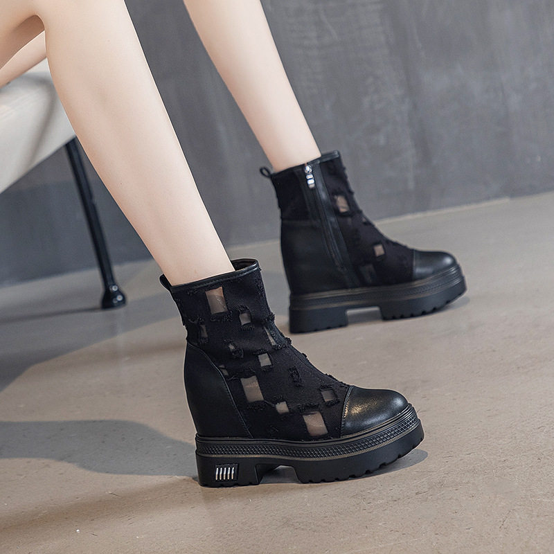 韩版时尚牛仔布厚底包头凉鞋女显瘦透气网纱内增高网鞋女外穿百搭