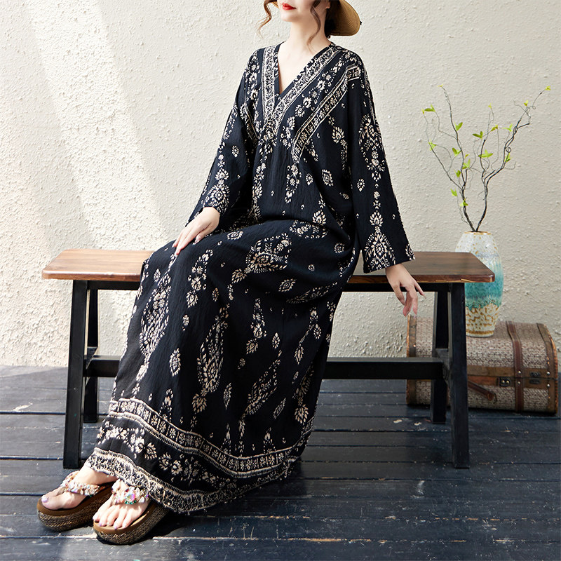 绵绸大码原创法式高级感长袖防晒V领垂感定位花宽松显瘦连衣裙女