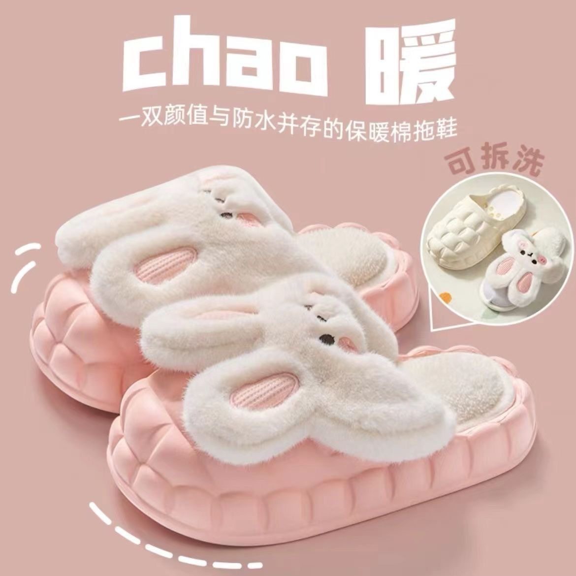 推荐理由:新款兔子防滑软底棉拖鞋,舒适度爆表!可爱卡通,时尚超萌,可拆卸,居家外出,爱意满满,让爱在冬日升温!