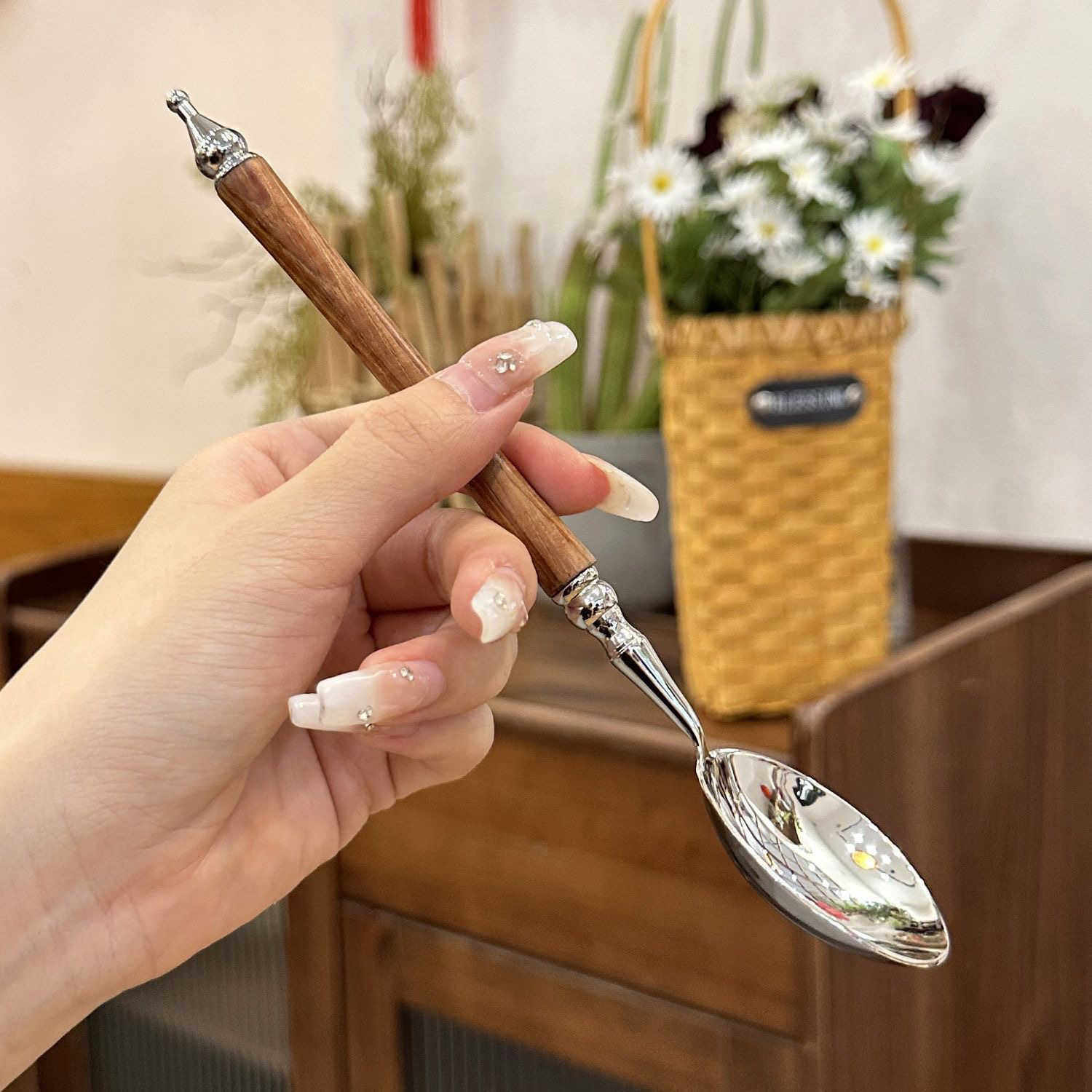 不锈钢勺子法式轻奢复古贵族仿木柄喝汤西餐勺干饭勺意面勺甜品勺