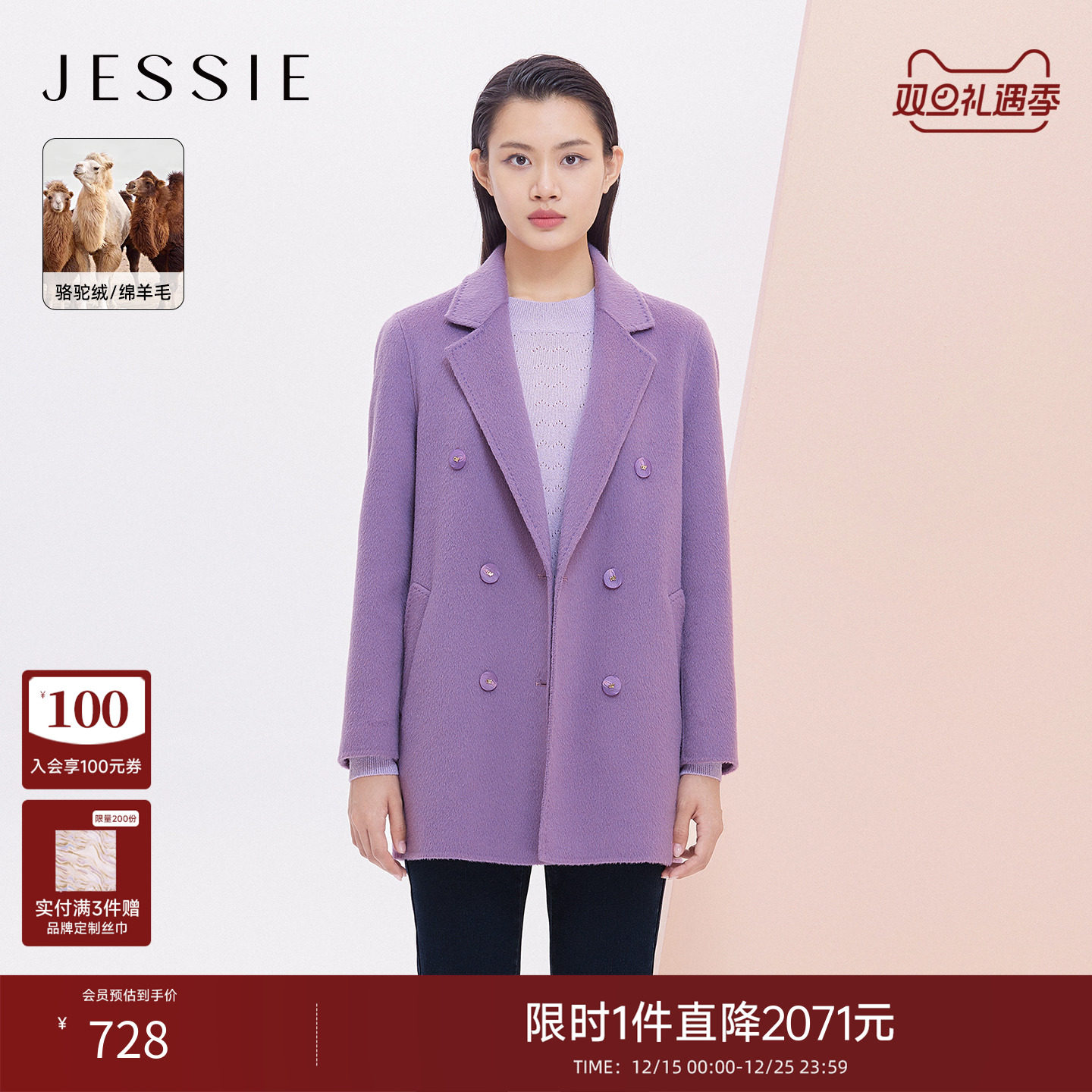 【商场同款】JESSIE气质翻领双排扣中长款毛呢外套女2025春新品