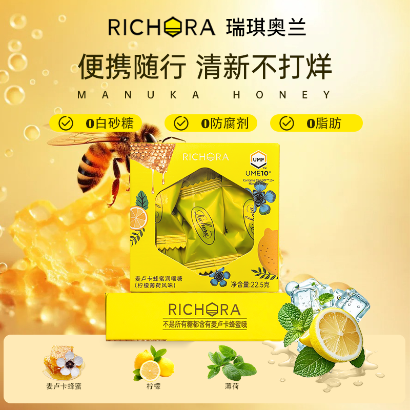瑞琪奥兰麦卢卡蜂蜜UMF10+润喉糖柠檬薄荷口味22.5g/盒清新舒嗓