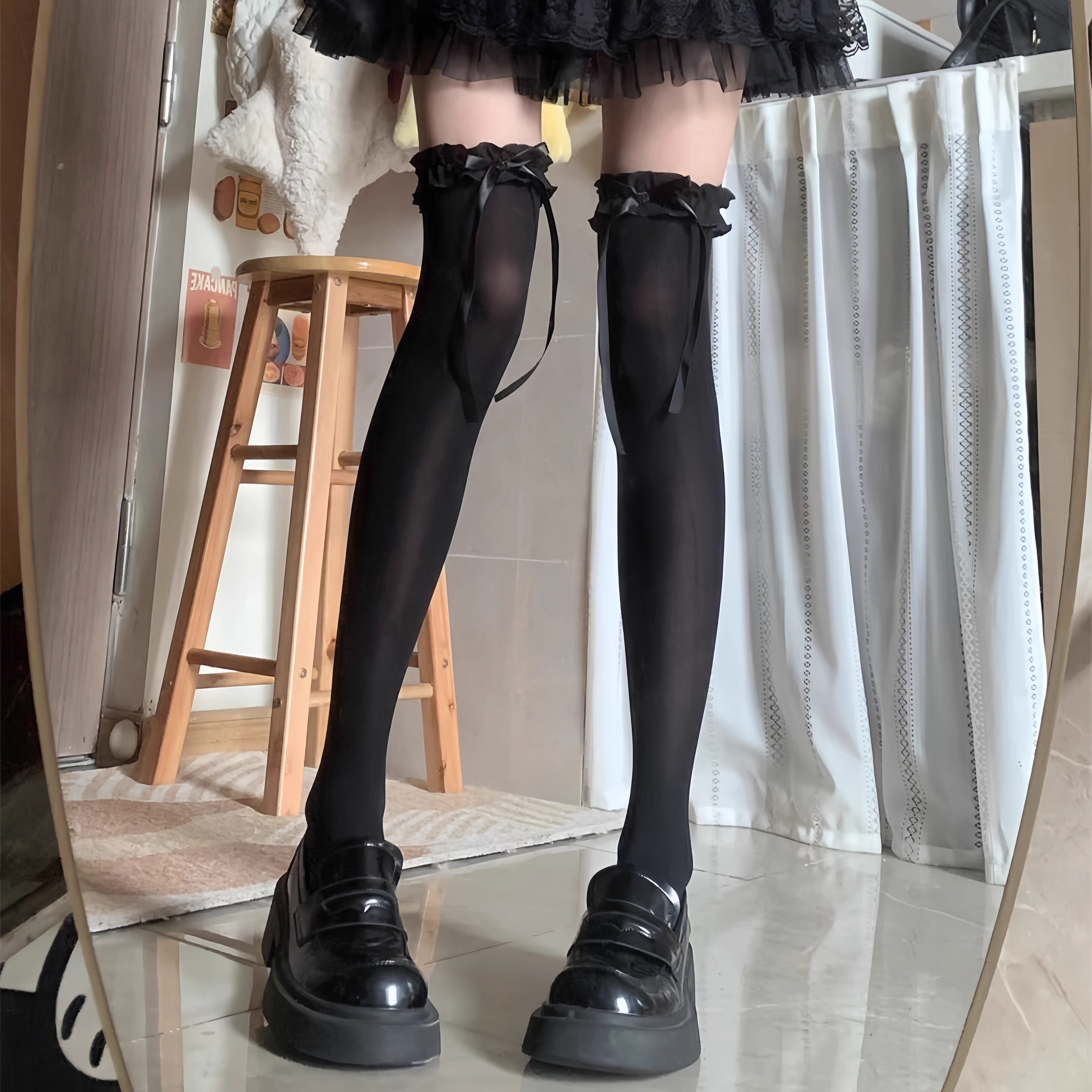 洛丽塔花边黑色lolita夏天薄款黑丝袜过膝袜蝴蝶结长筒袜子木耳边