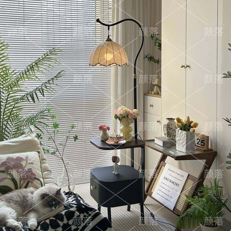 中古风卧室床头柜台灯一体客厅沙发旁边落地灯置物架氛围感钓鱼灯
