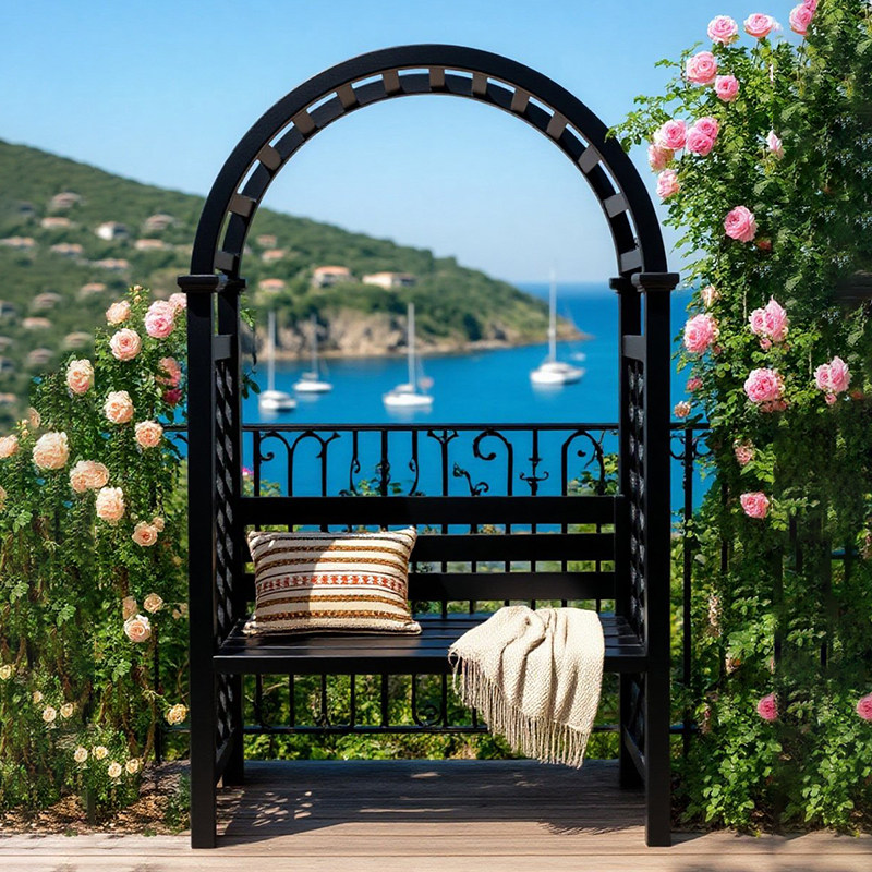 户外庭院防腐木黑色拱门花架阳台室外花园装饰拱形双人座椅爬藤架