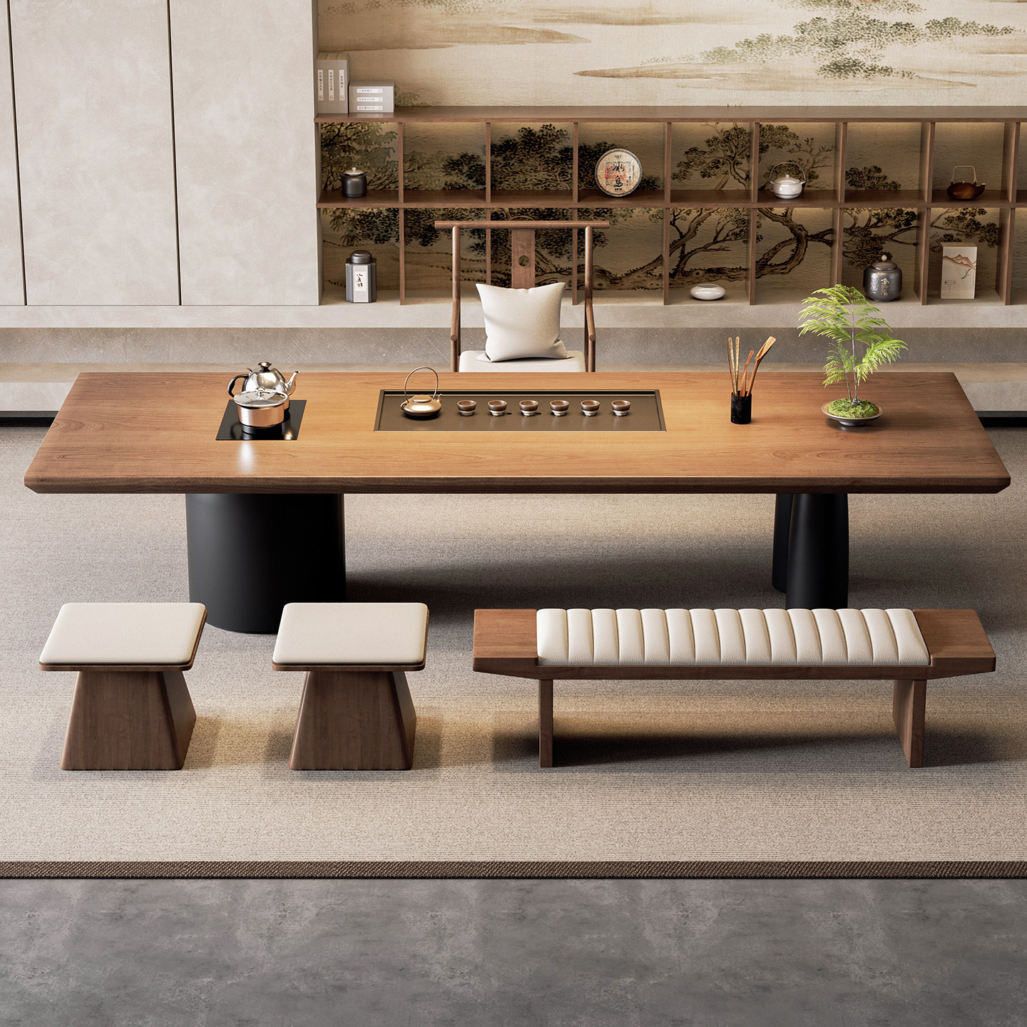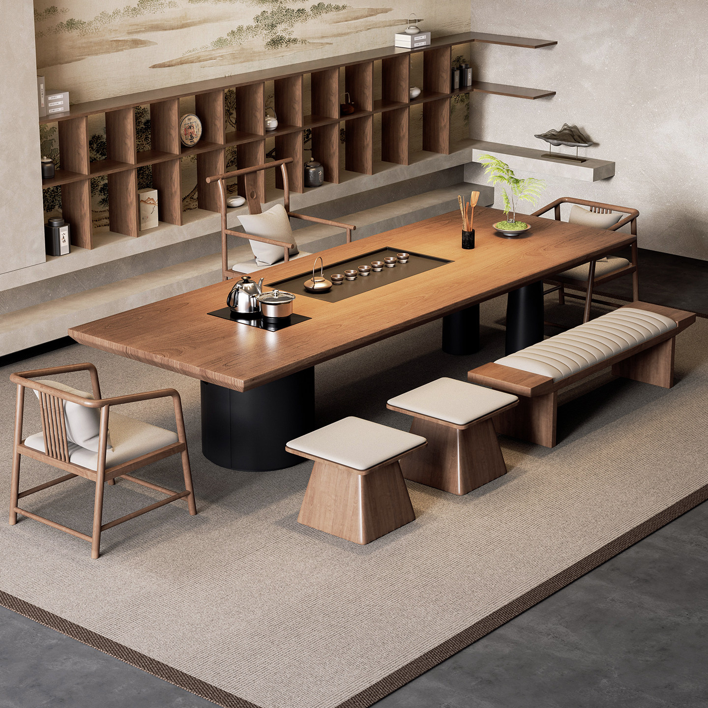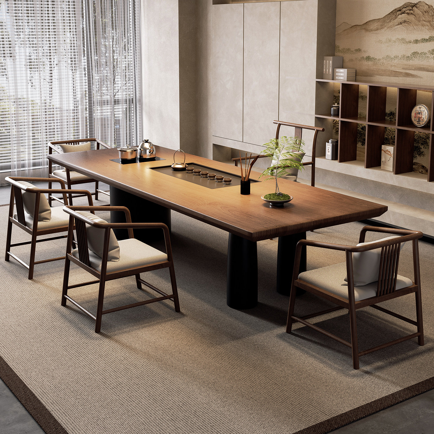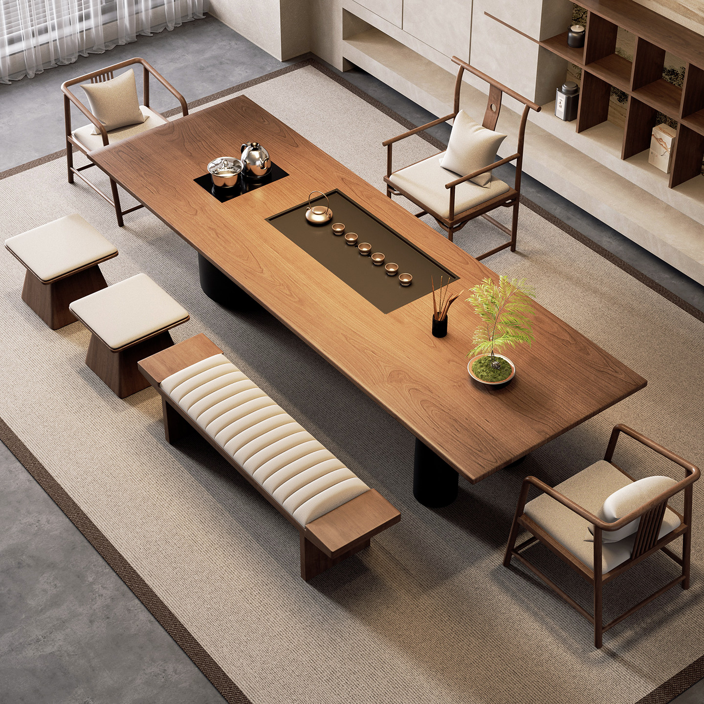 宋代美学实木茶桌椅组合一桌五椅新中式大板桌办公室客厅家用茶台