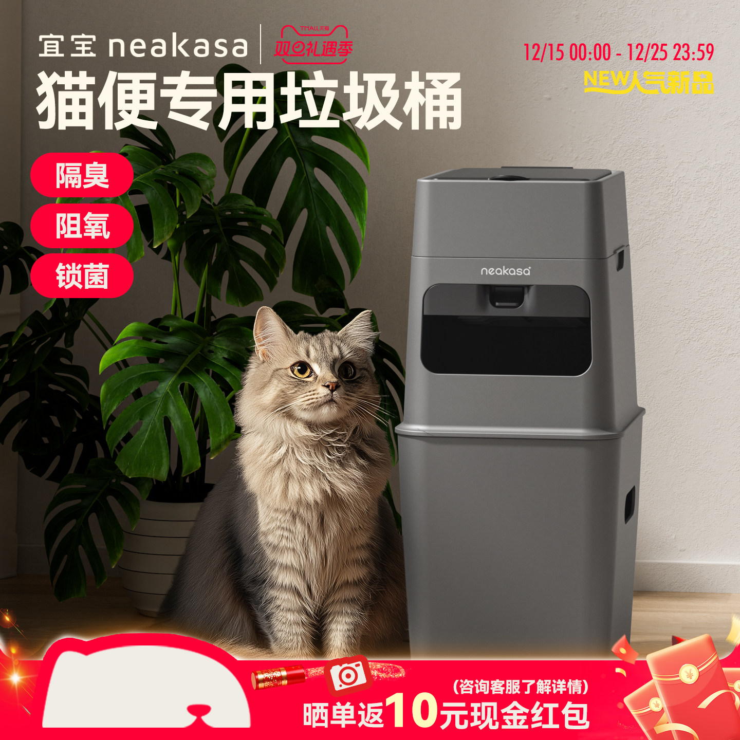 宜宝猫砂专用隔臭垃圾桶9.2L封闭阻氧锁菌多猫铲屎专用宠物粪便桶