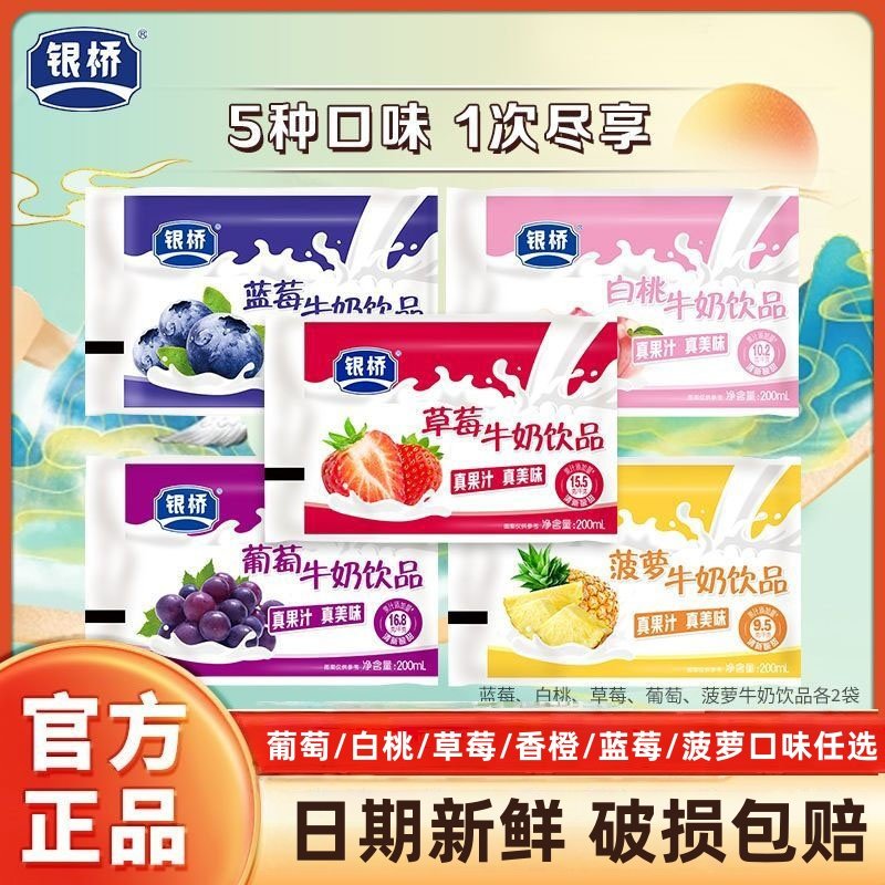 银桥草莓葡萄香橙白桃酸牛奶饮品早餐奶纯奶袋装200ml*16牛奶整箱
