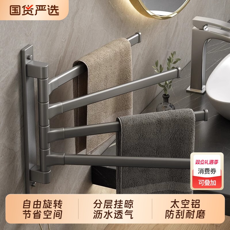 旋转毛巾挂杆架卫生间浴巾收纳挂架浴室转角免打孔太空铝吸盘置物