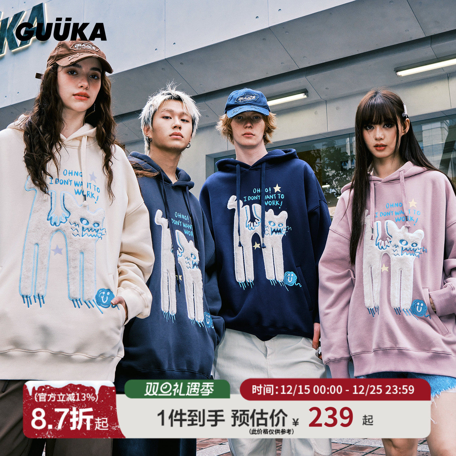 GUUKA潮牌情侣卫衣男加绒秋新款 多巴胺上衣猫咪刺绣连帽衫女宽松