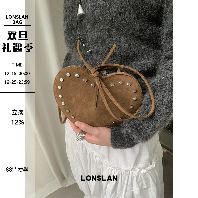 Lonslan BAG 2025NEW 复古吸睛铆钉设计麂皮爱心单肩斜挎包包