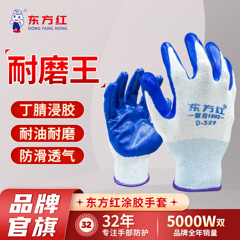 东方红劳保手套作业工地搬砖防滑耐磨防护挂涂胶涂掌尼龙浸胶手套
