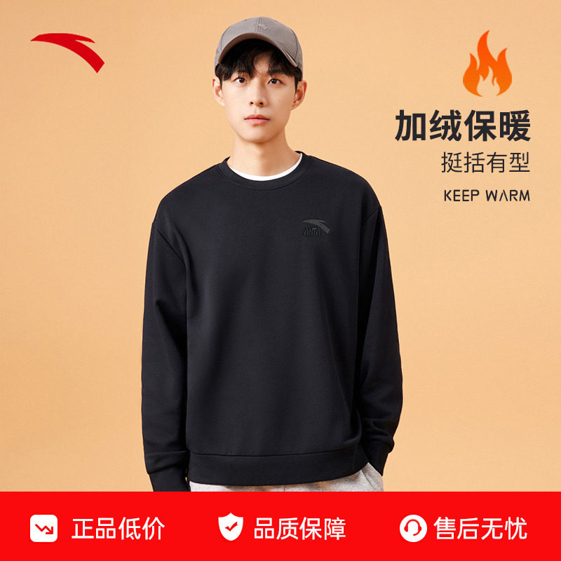 安踏加绒卫衣男保暖圆领套头衫男款2025冬季加厚宽松男士运动上衣