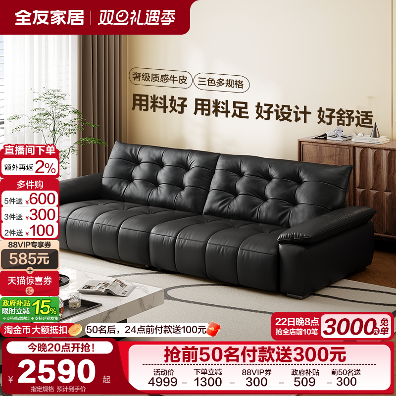 全友家居2025新款简约黑色真皮沙发轻奢客厅钢琴键大黑牛沙发家具
