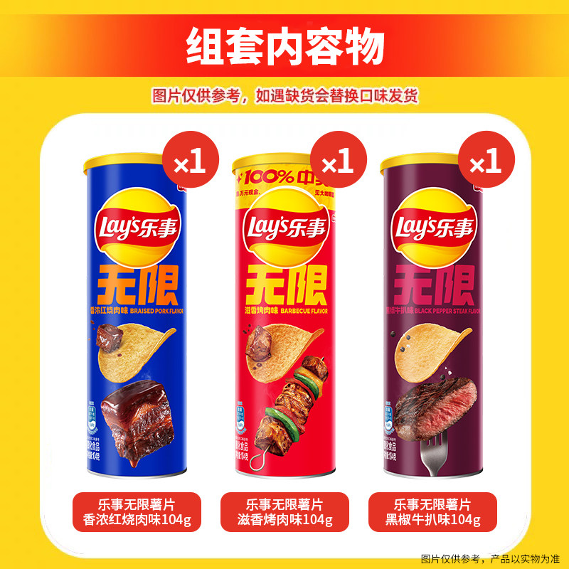 乐事无限薯片无肉不欢三连罐(烤肉/红烧肉/牛扒)104g*3罐