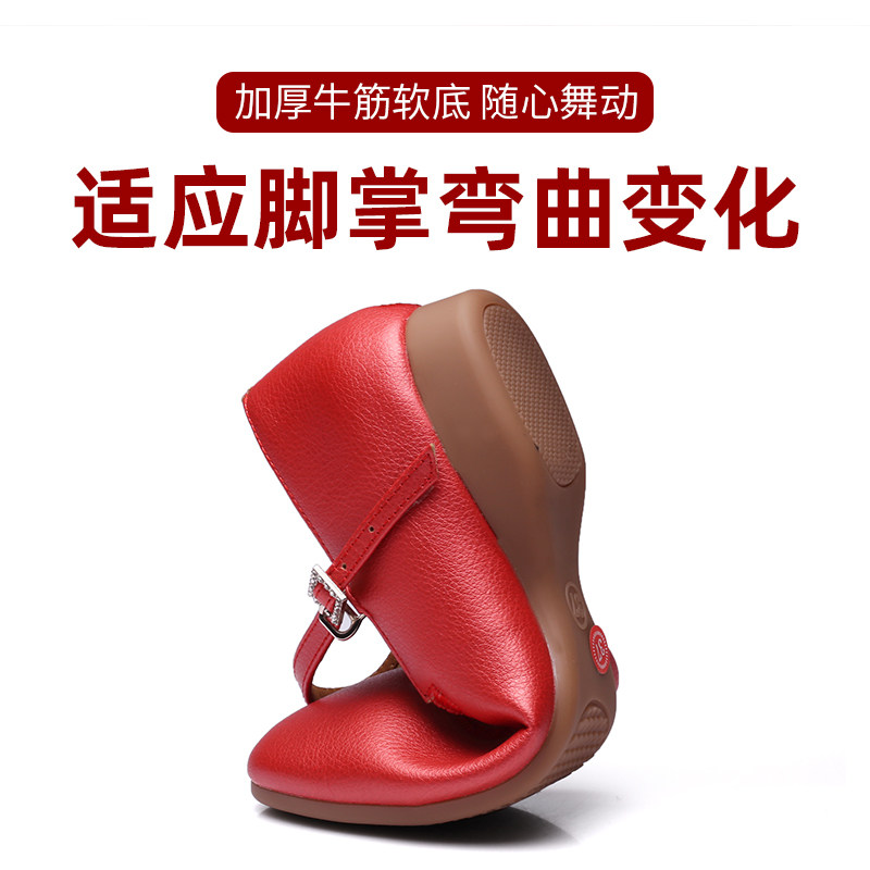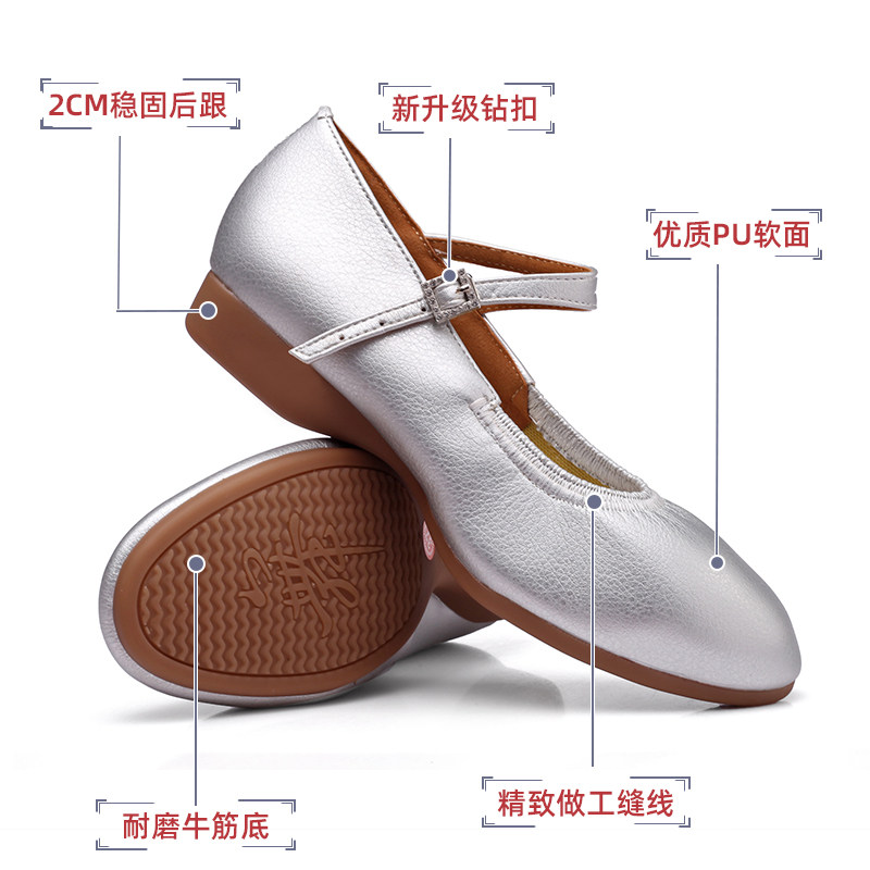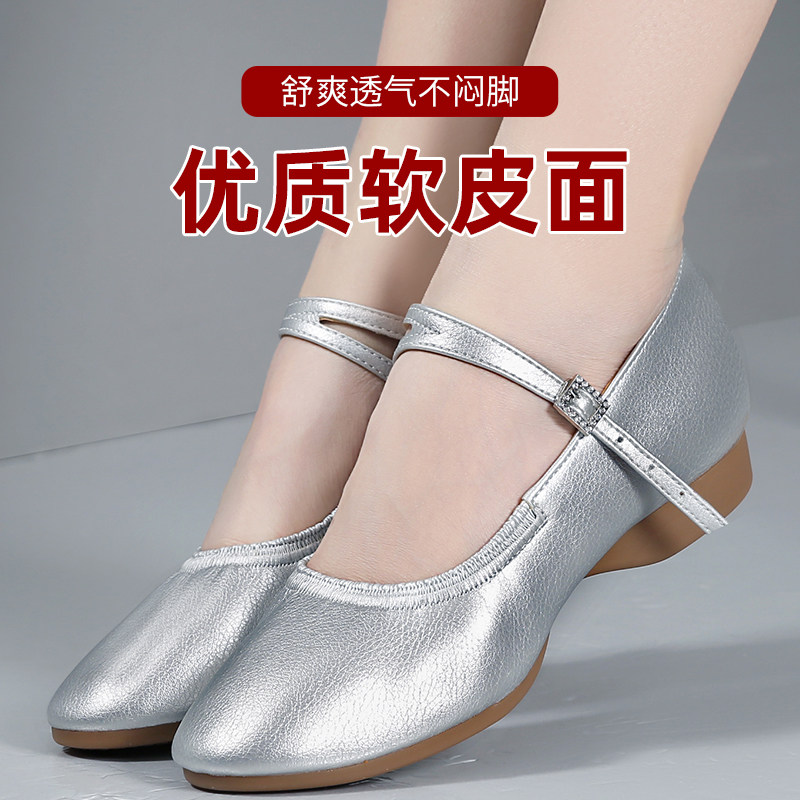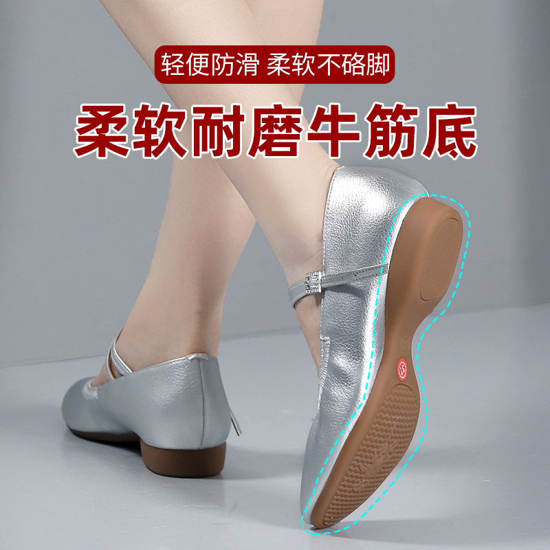 银色舞蹈鞋女成人表演专用新款软底皮面室外女士平底跳舞广场舞鞋