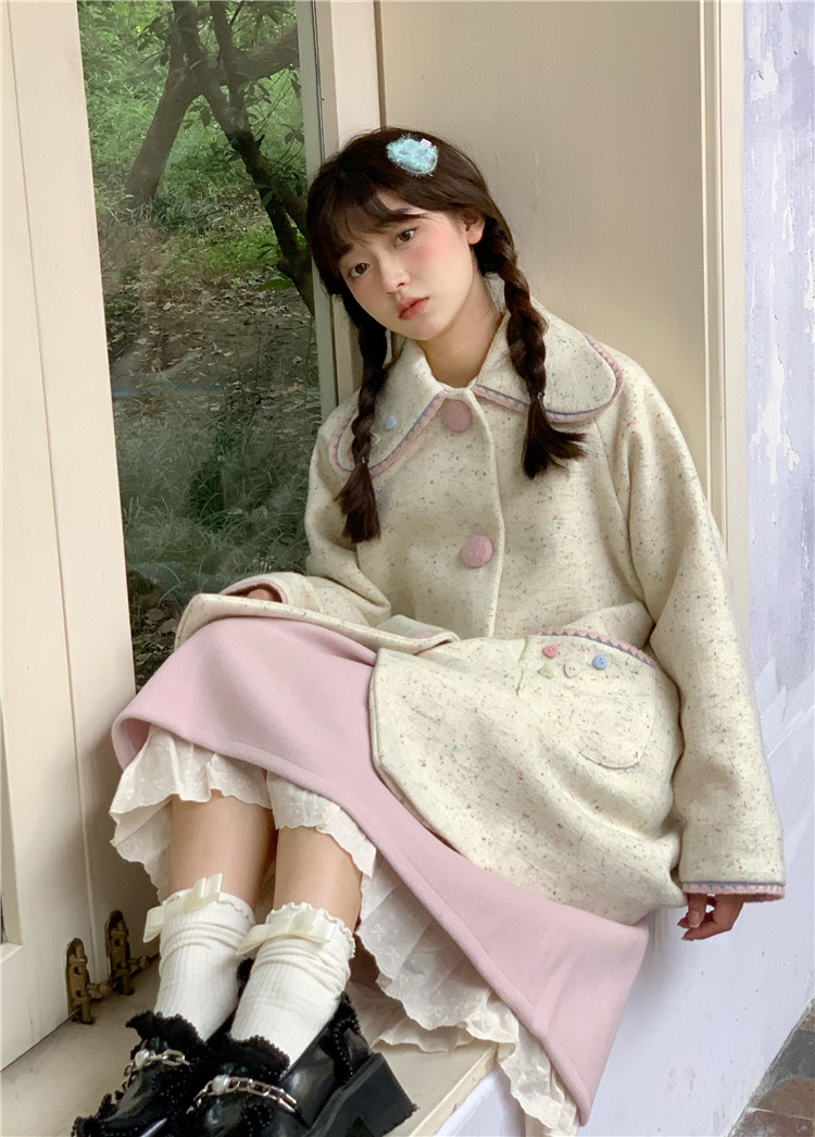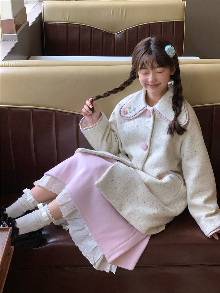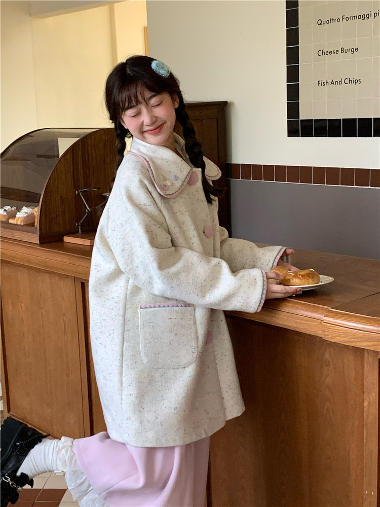 推荐理由:蛋包饭餐厅毛呢外套女2025冬季新款米色杂点少女中长款呢子大衣