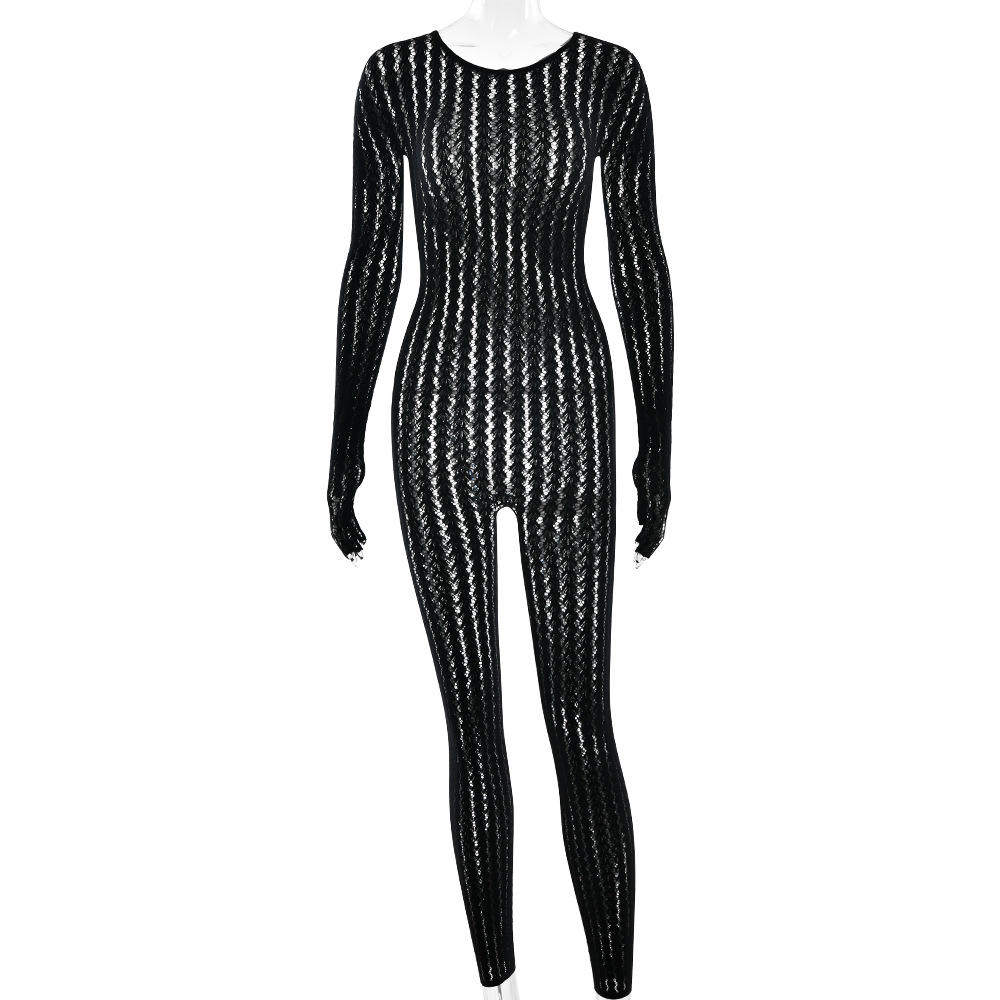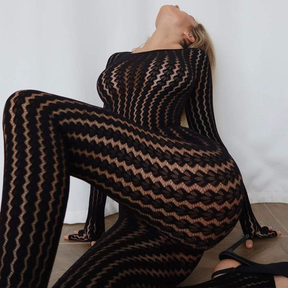 欧美风性感夏季透视衣时尚无缝条纹提花长袖连体长裤连体衣/裤