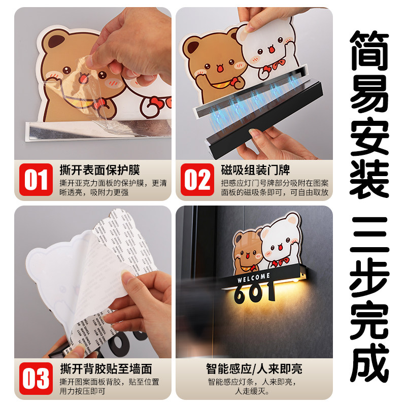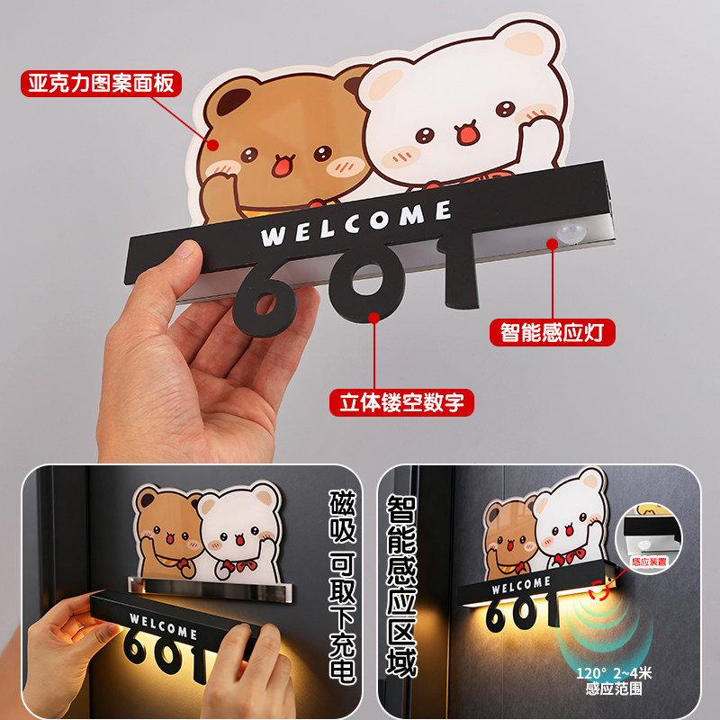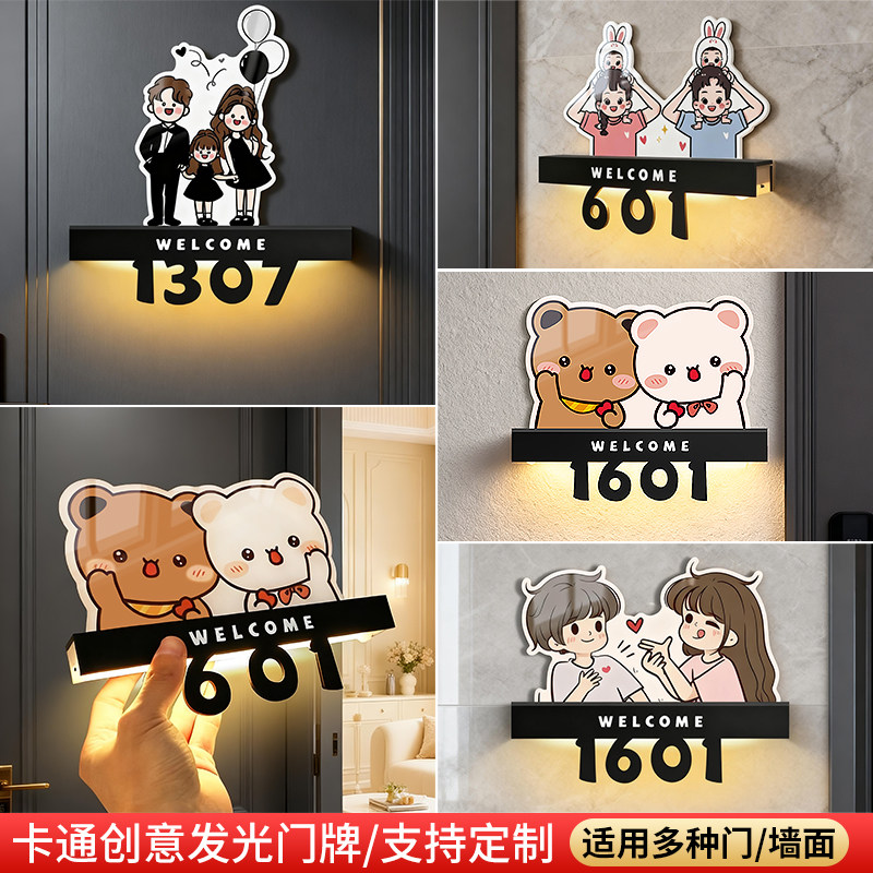 一二布布门牌号高级感轻奢创意可爱发光装饰号码牌自粘宿舍卧室房间入户门口温馨房号卡通提示挂牌贴定制定做