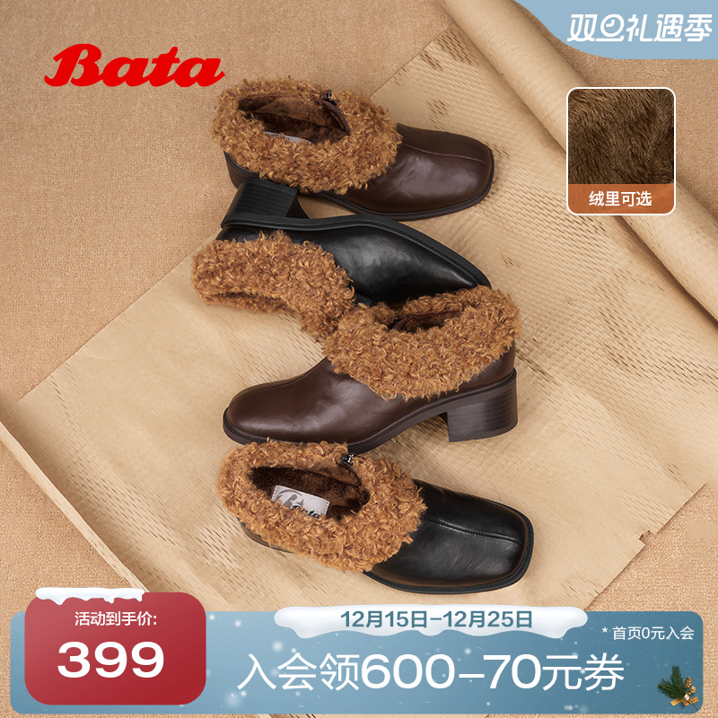 Bata羊皮书双重奏25冬商场新款软底复古粗跟加绒毛毛鞋女ATO15DM5