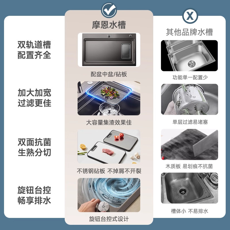 推荐理由:摩恩官方厨房水槽套餐大单槽集渣槽不锈钢洗菜盆家用洗碗槽洗碗池