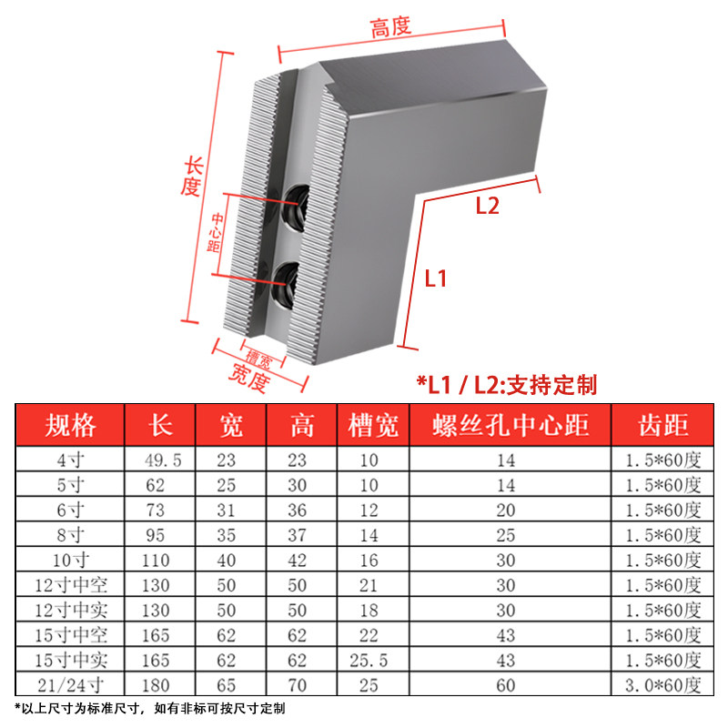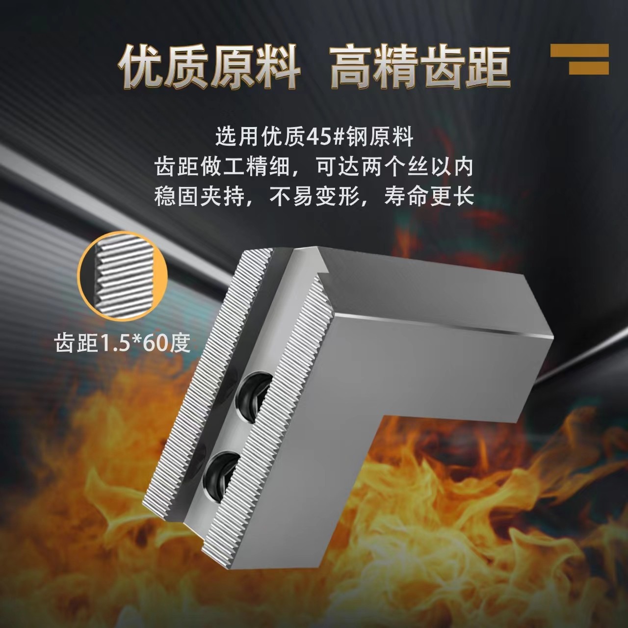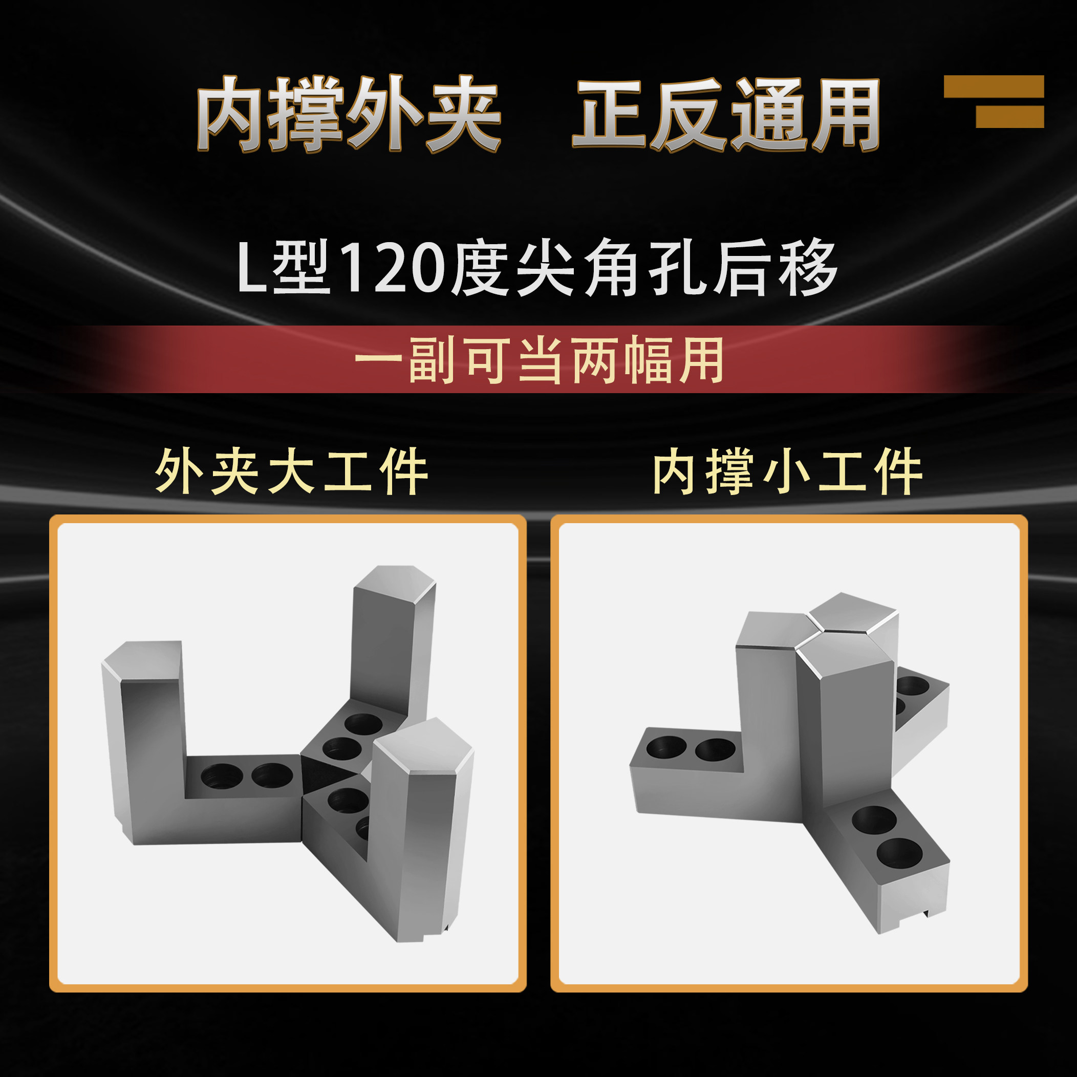 推荐理由:油压卡盘L型三爪56810寸加高卡爪液压软爪台阶卡爪120度尖孔后移