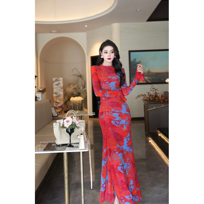 尤克菲儿 原创高定轻奢网布印花优雅秋季长裙气质连衣裙
