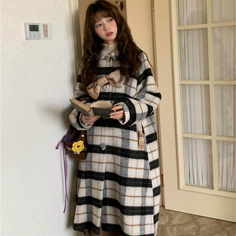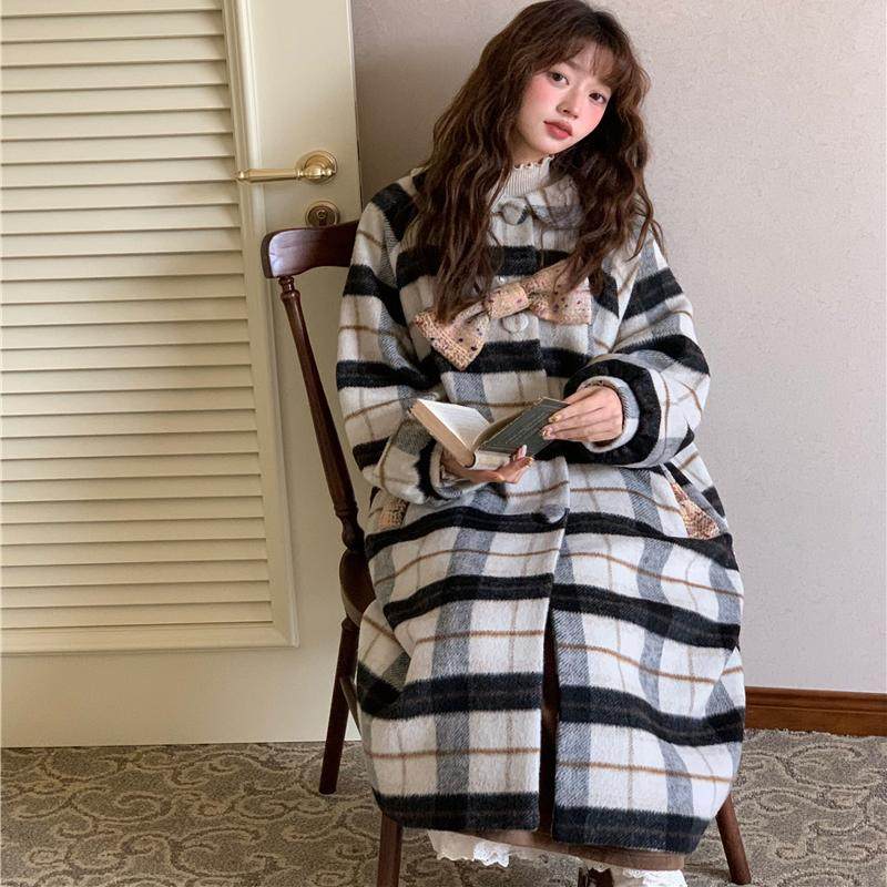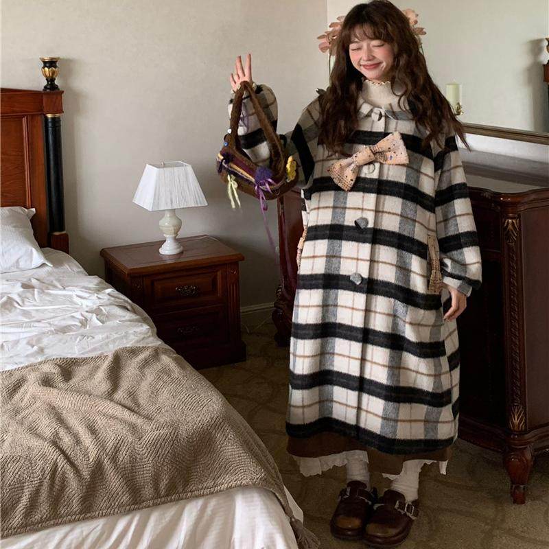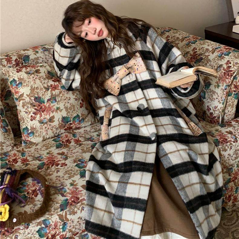 推荐理由:蛋包饭餐厅2025冬新款韩版宽松格子毛呢外套女中长款加厚保暖大衣