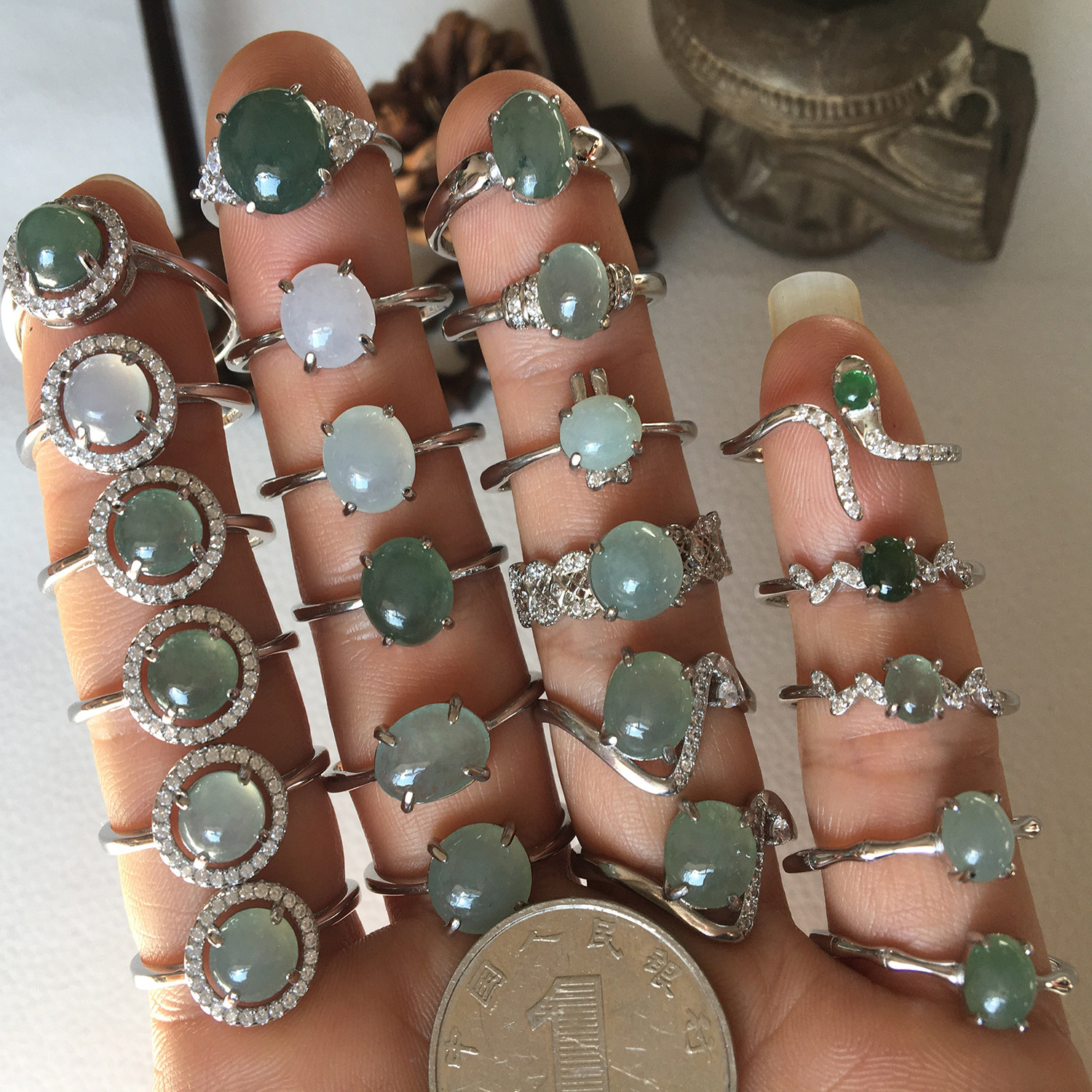 推荐理由:清仓批货拿货缅甸天然A货翡翠冰种蛋面蓝水戒面925银镶嵌玉戒指
