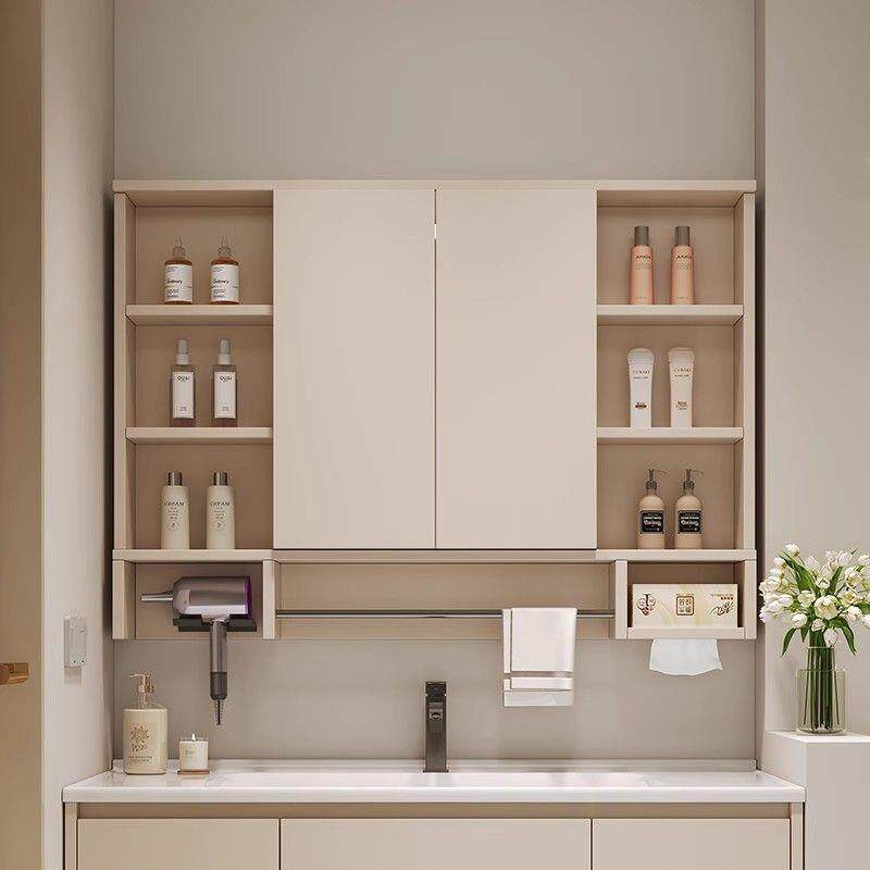 卫生间奶油风多层实木隐藏折叠智能单独挂墙式风水镜带毛巾杆置物