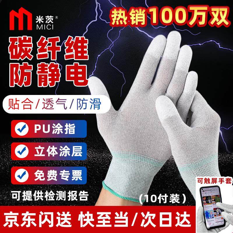 米茨防静电手套碳纤维涂指手套PU涂层轻薄无尘透气防滑装机劳保手