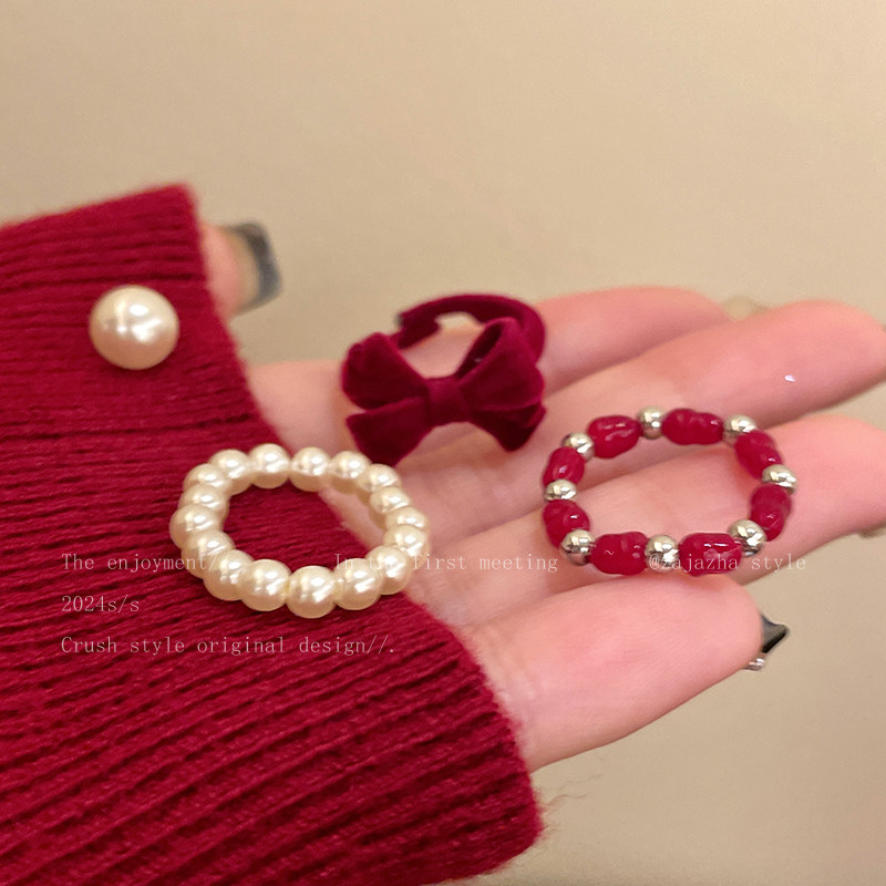 安可拉红色丝绒珠珠戒指女款甜美叠戴食指戒轻奢高级指环小众气质