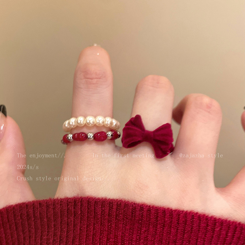 推荐理由:安可拉红色丝绒珠珠戒指女款甜美叠戴食指戒轻奢高级指环小众气质