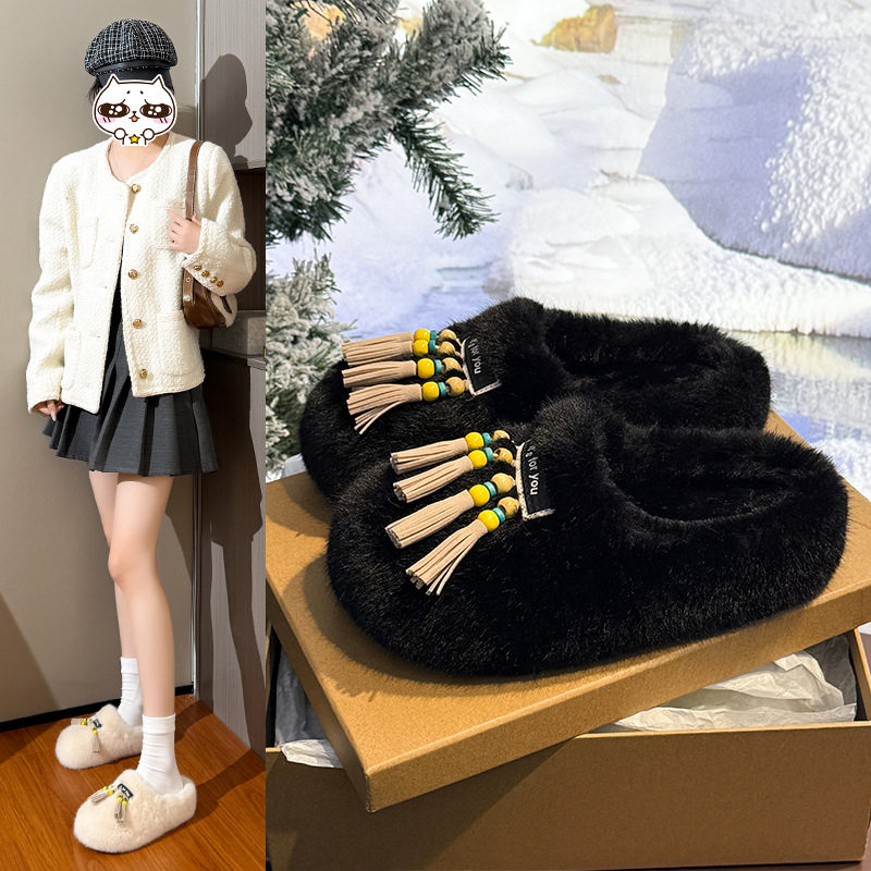 包头半拖鞋女外穿冬季流苏串珠厚底休闲加绒包拖鞋其他拖鞋橡胶