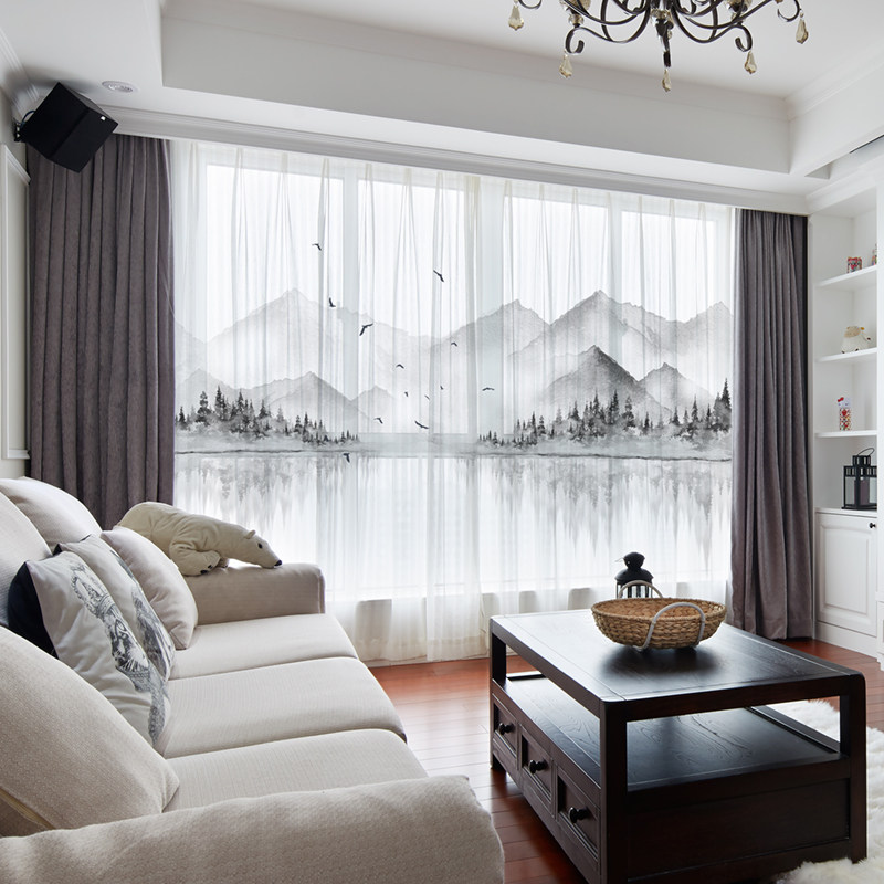 定制新中式水墨山水国画挂钩窗帘 客厅卧室书房飘窗落地窗帘窗纱