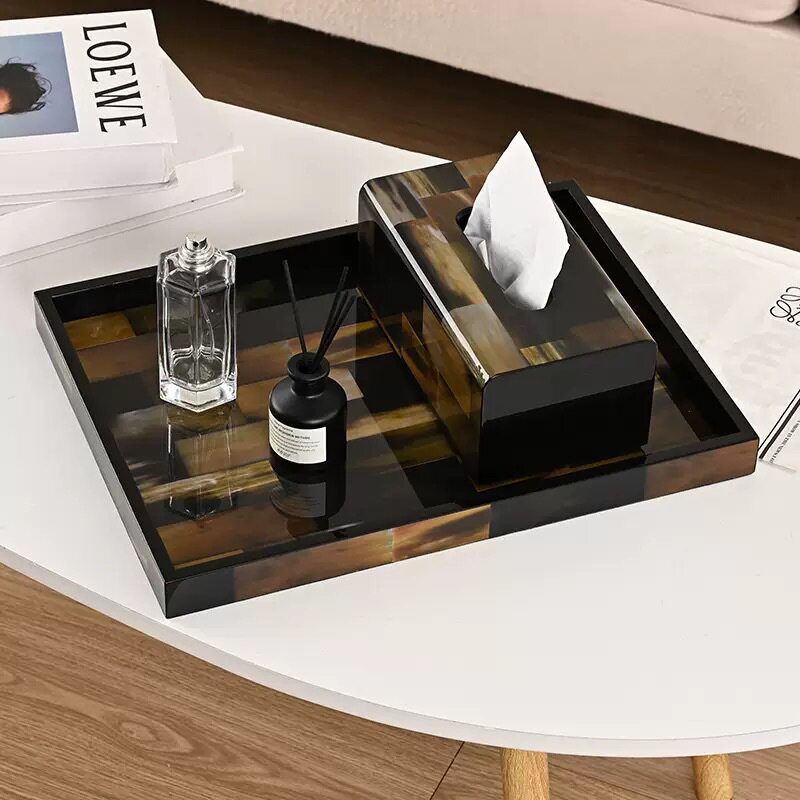 美豹小众复古长方形皮革烤漆托盘样板房售楼部餐桌书房收纳工艺品
