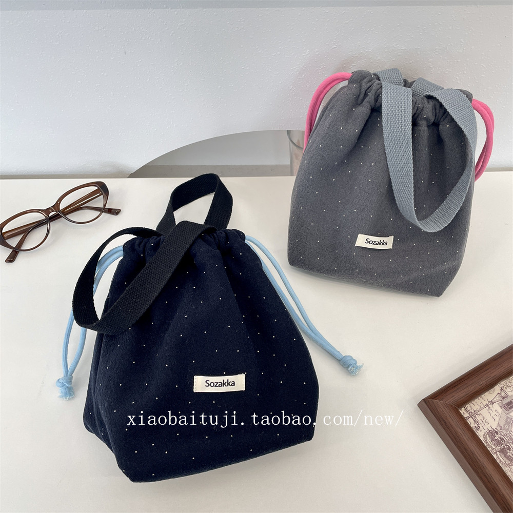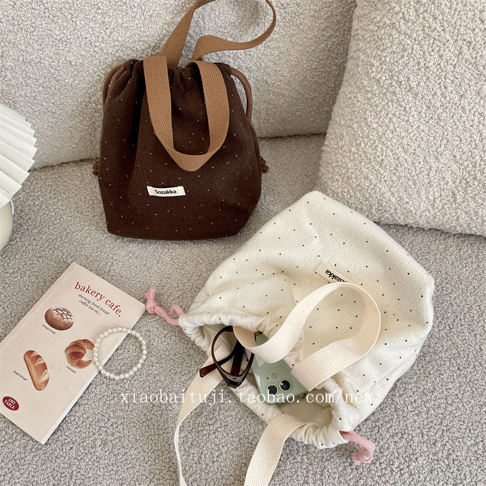 小白兔几 毛呢波点抽绳束口袋手提小拎包外出逛街杂物手提便当包