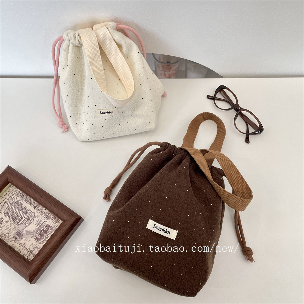 推荐理由:小白兔几 毛呢波点抽绳束口袋手提小拎包外出逛街杂物手提便当包
