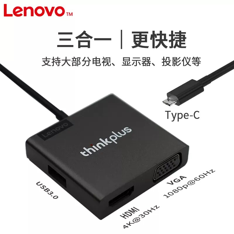 联想Thinkplus USB-C 3合1便携扩展器 Type-c转VGA和HDMI和USB3.0一拖3口HUB分线器air笔记本1080P高清