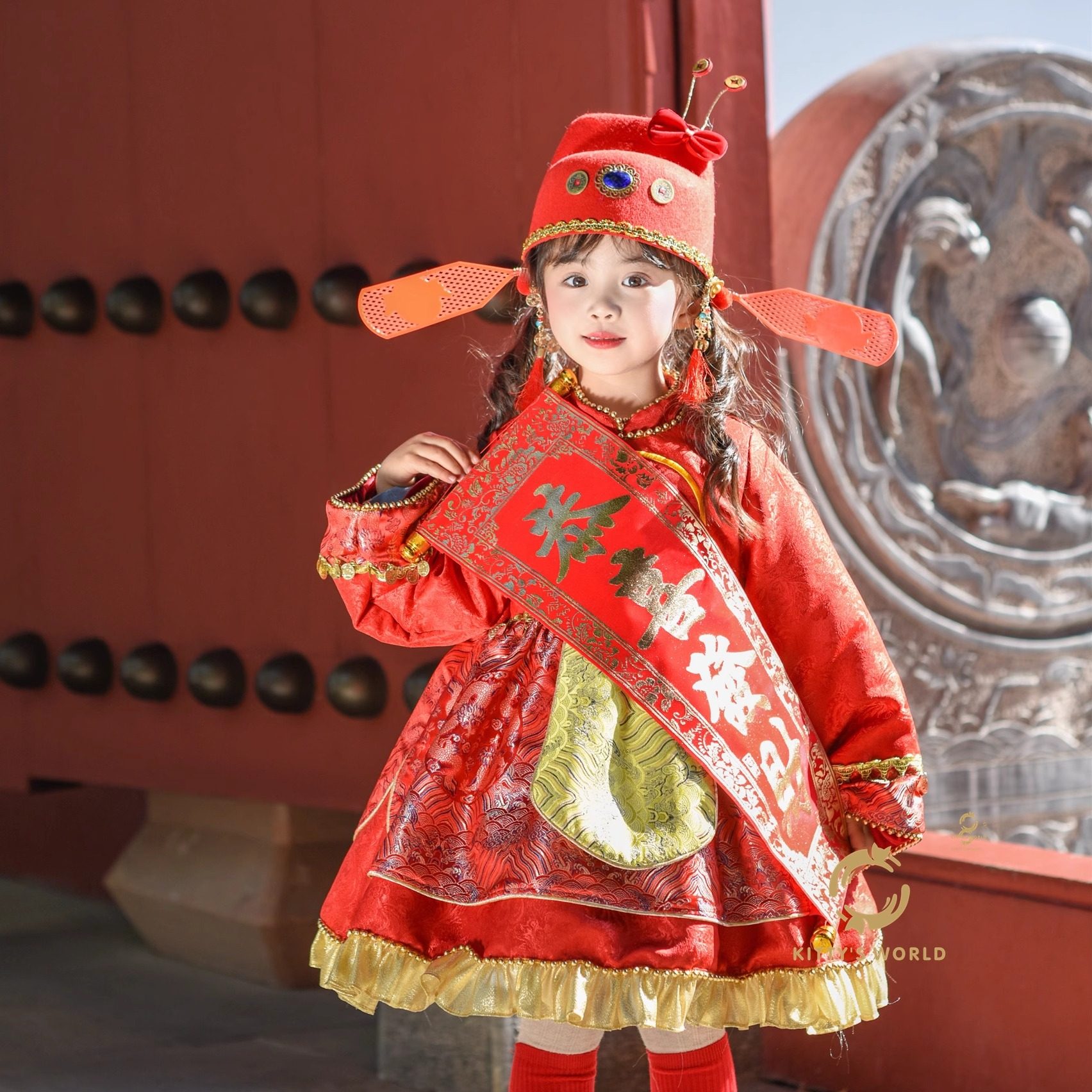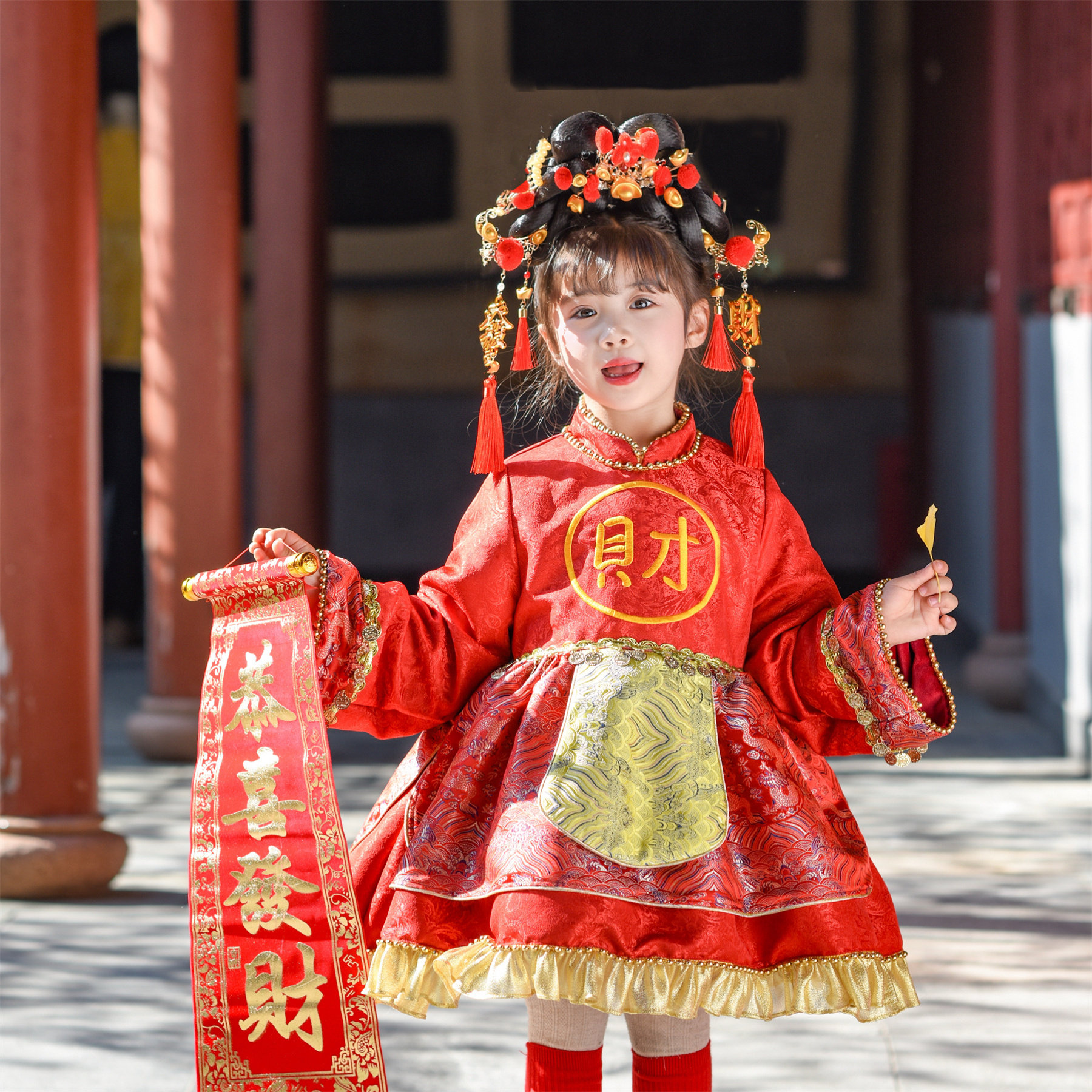 原创小财神拜年服cos儿童红色喜庆加绒中式汉服女童洛丽塔公主裙