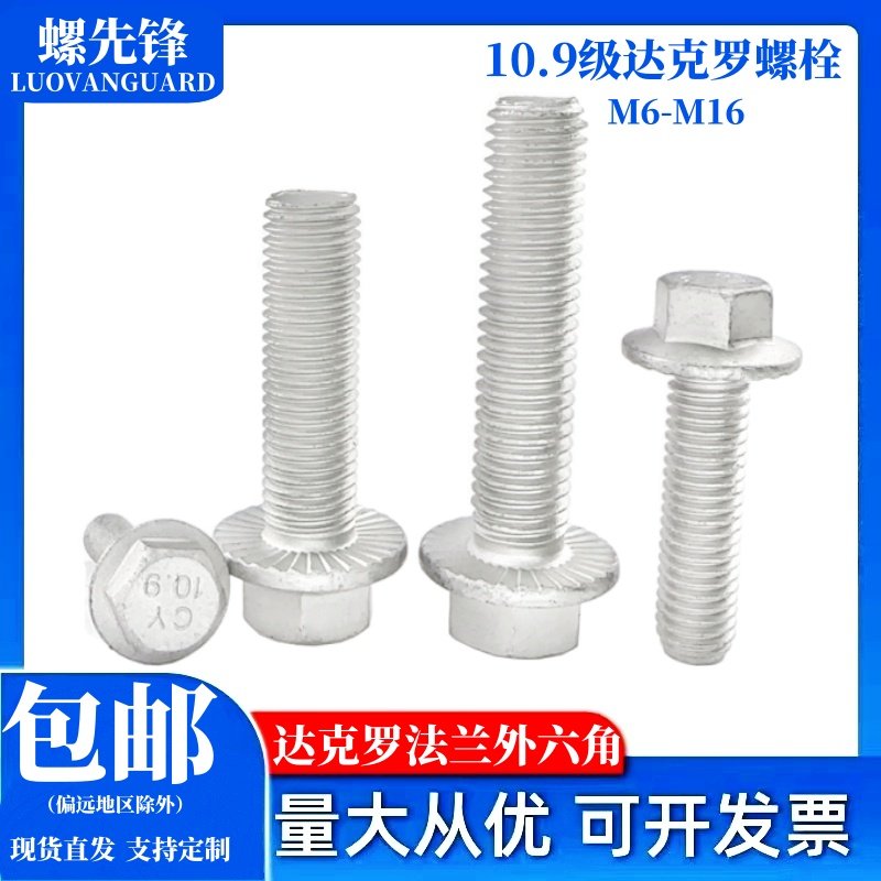 10.9级达克罗法兰外六角螺栓方头带法兰带齿防松盘螺丝钉M6M8-M16